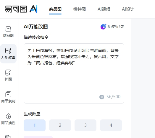 如果自己没有能力进行海报制作的话,其实也不需要担心,因为 易可图AI 万能改图也能够帮助你完成这项工作。我们可以利用 易可图的AI万能改图功能为自己的跨境店铺创作出各种各样的精美海报。下面我为大家介绍如何借助易可图的 AI万能改图功能为自己做一张高颜值、有卖点的跨境海报。