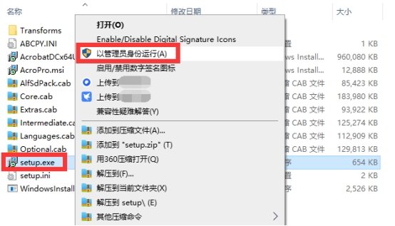 3、找到【Setup】程序文件,鼠标右键,选择【以管理员身份运行】。