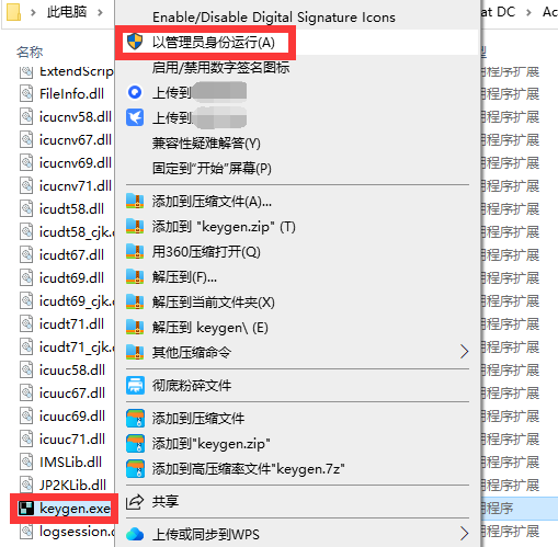 15、对着刚粘贴过来的【keygen】文件,鼠标右键,选择【以管理员身份运行】。