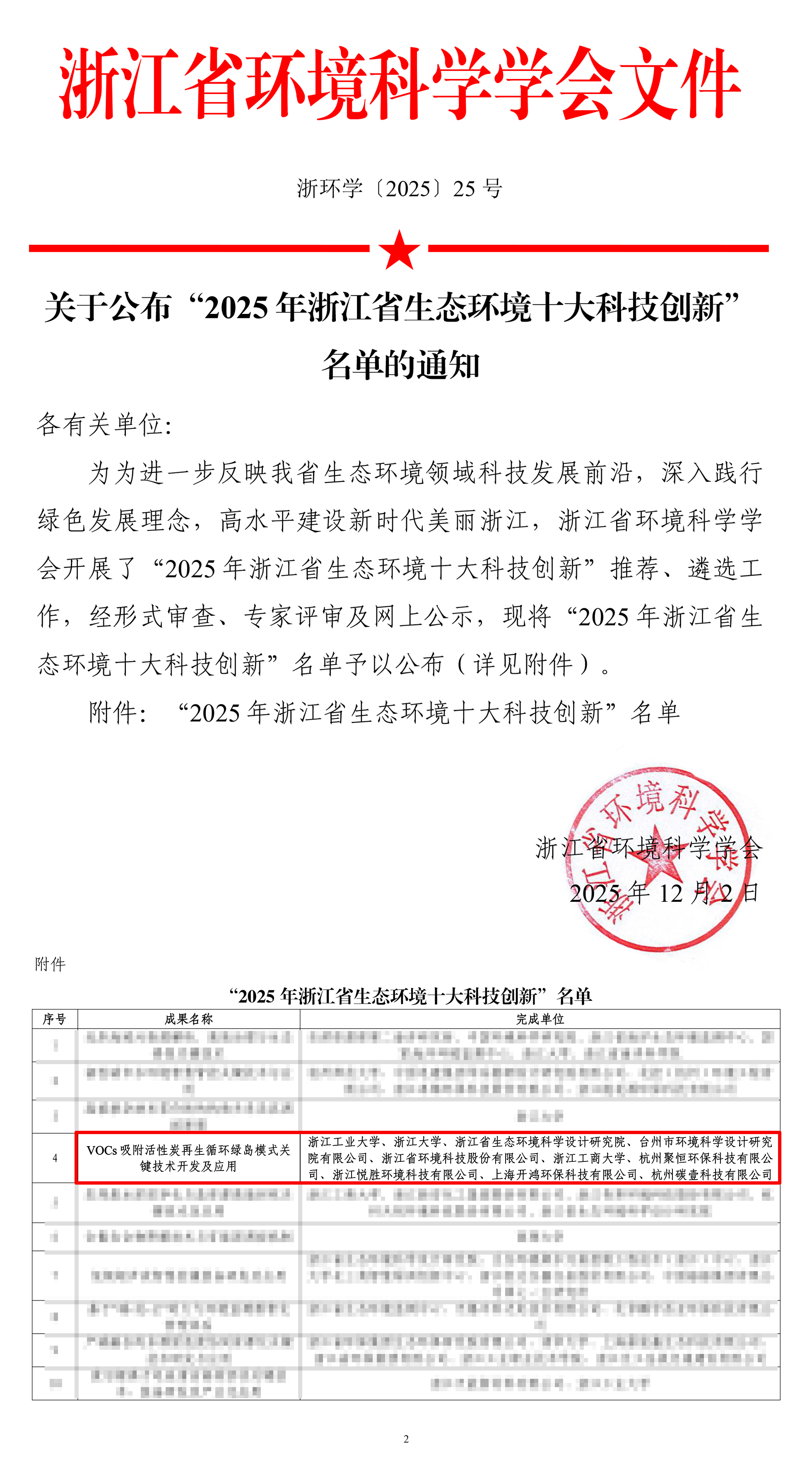 2025年12月2日,浙江省环境科学学会正式发布“2025年浙江省生态环境十大科技创新”名单,浙江工业大学、浙江大学、浙江省生态环境科学设计研究院、上海开鸿环保科技有限公司等10余家高校及科研、环保单位共同推进的《VOCs吸附活性炭再生循环绿岛模式关键技术开发及应用》成功入选!作为参与单位之一,开鸿环保此次携手省内顶尖高校及科研机构斩获省级荣誉,既是省级权威机构对公司技术实力与创新成果的高度认可,更标志着公司在工业污染治理“资源化循环”与“企业降本增效”领域的实践,已获得行业与主管部门的充分肯定。