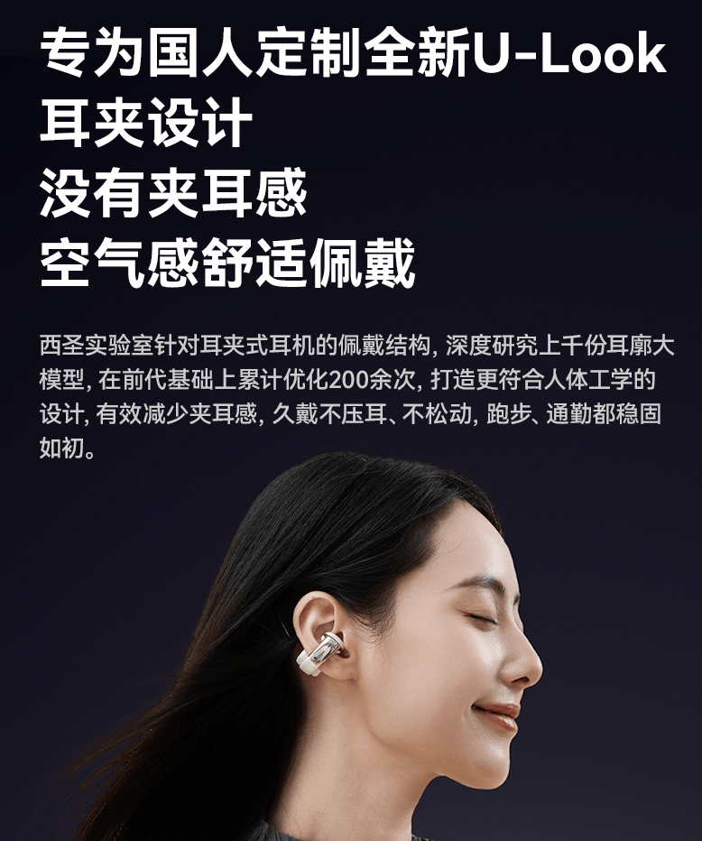 结合全新U-Look耳夹设计,针对国人耳型深度优化,经过1000+份耳廓模型研究与200余次调校,打造更符合人体工学的设计,彻底消除夹耳感,即便长时间通勤或运动,也不易松动,完美解决了相比传统耳夹式耳机易疲劳、久戴不舒适的弊端,Plume提供了更加轻盈、贴合、稳固的佩戴体验。