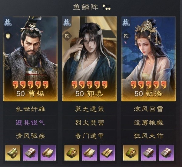 魏法弓就算在角色等级相对弱势的情况下也能战胜铜雀台,是不是很涨士气?实际交战下来基本没有怕的,不用躲避任何队伍直接撞。兵书推荐带两个缴械,因为打一些暴力输出需要等第二回合狂风+郭嘉爆炸输出联动。郭嘉一个人场均2.5W输出。有控制有输出有回复。