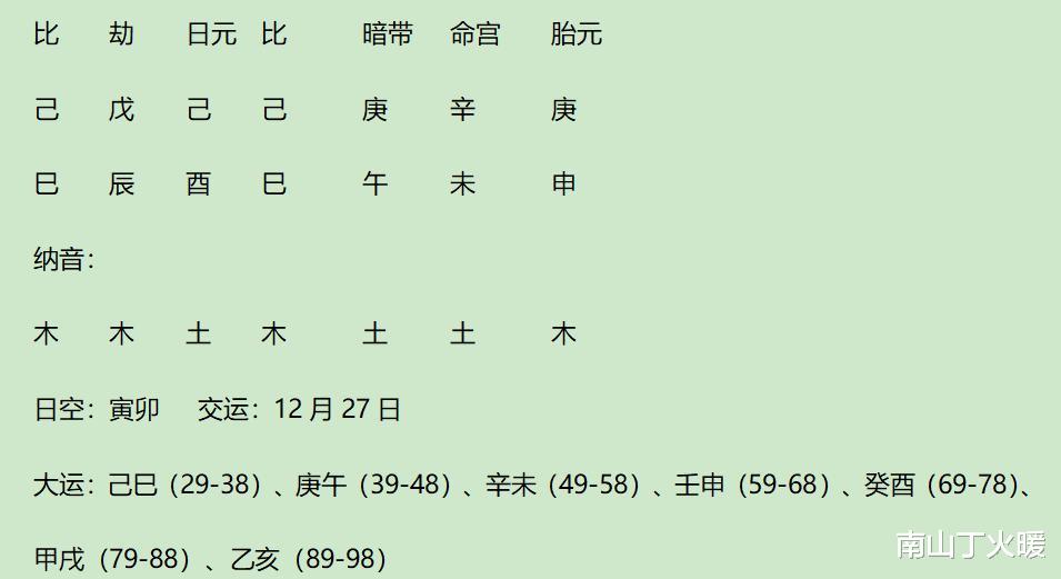 此年,辛食生癸财,癸财制丁偏印;大运未与年支巳拱午,流年巳合胎元申,小限未与年支巳拱午,3未暗冲1丑。