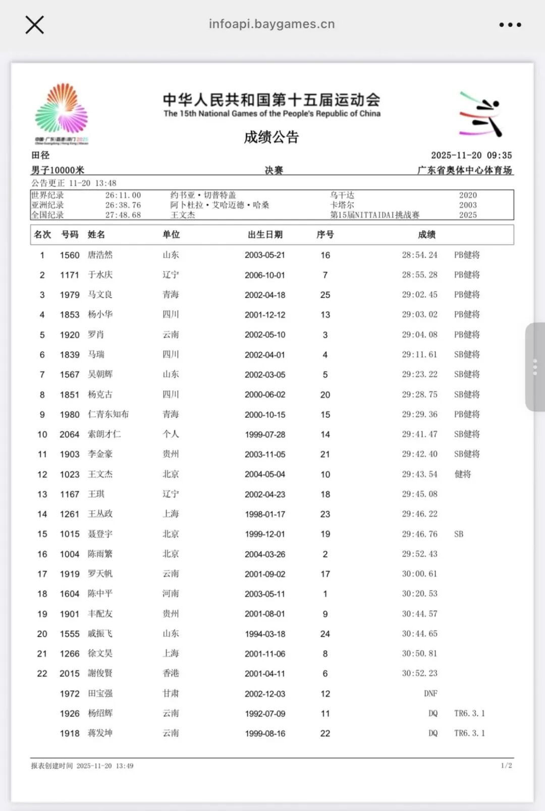 当天下午,十五运会官方信息平台发布成绩,云南队两名选手显示DQ(取消比赛资格)。