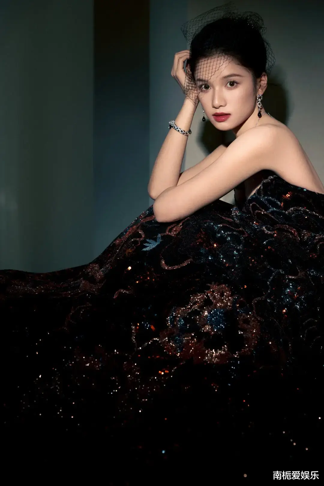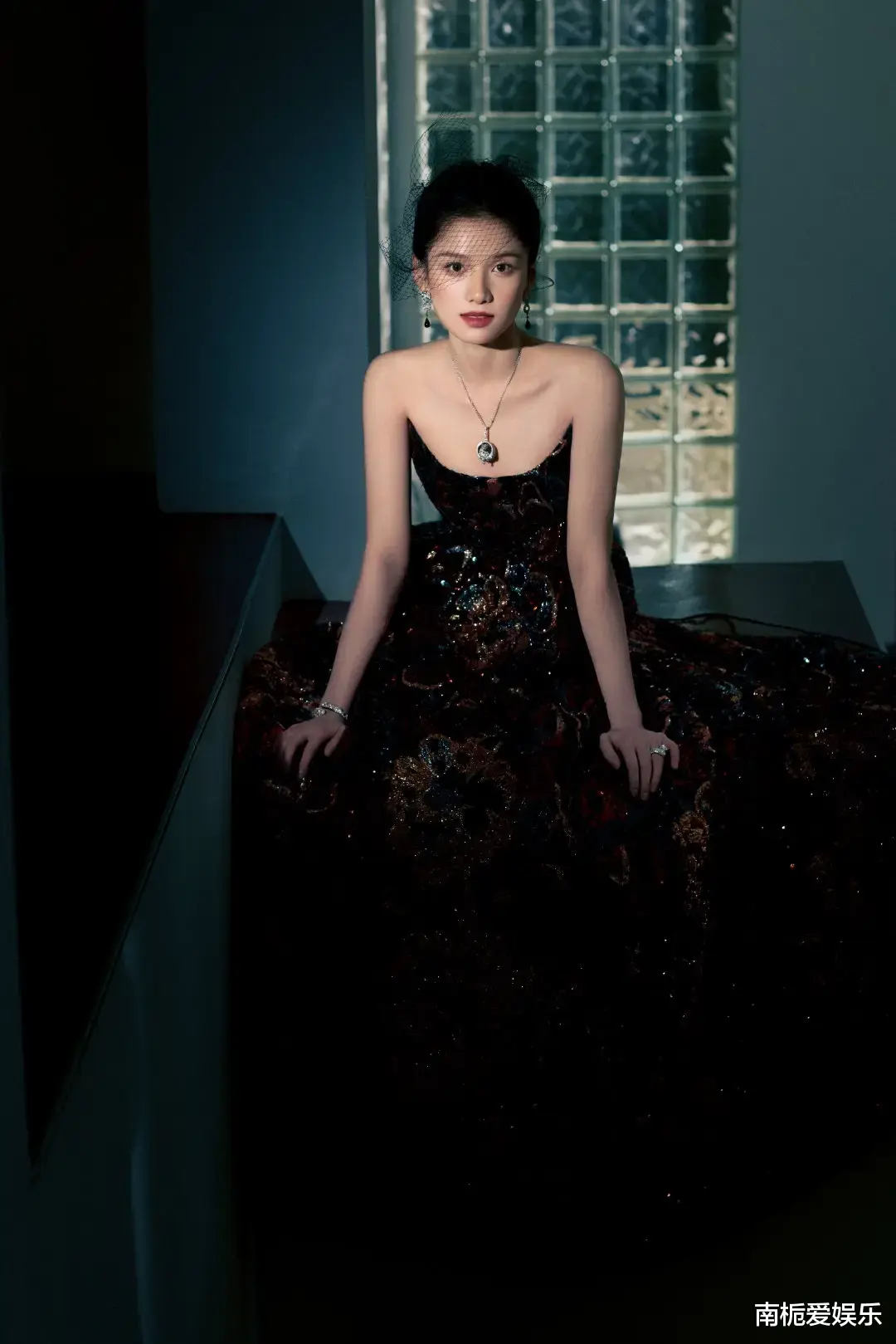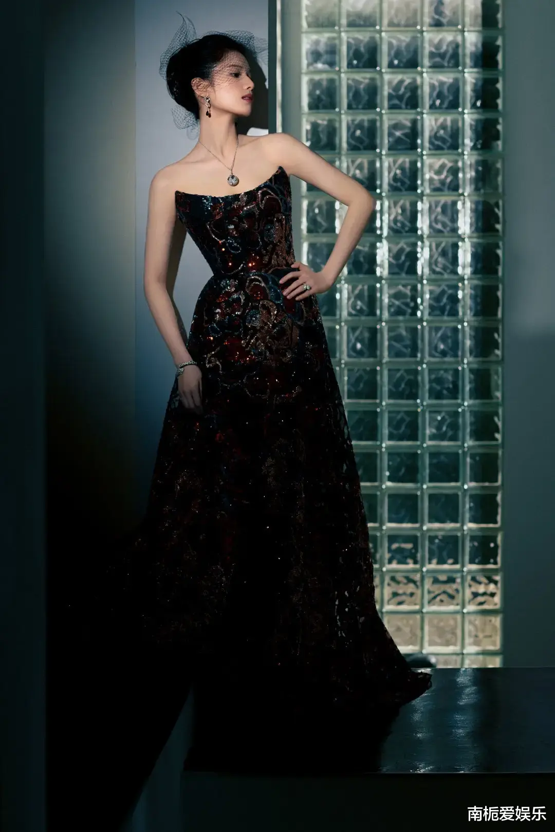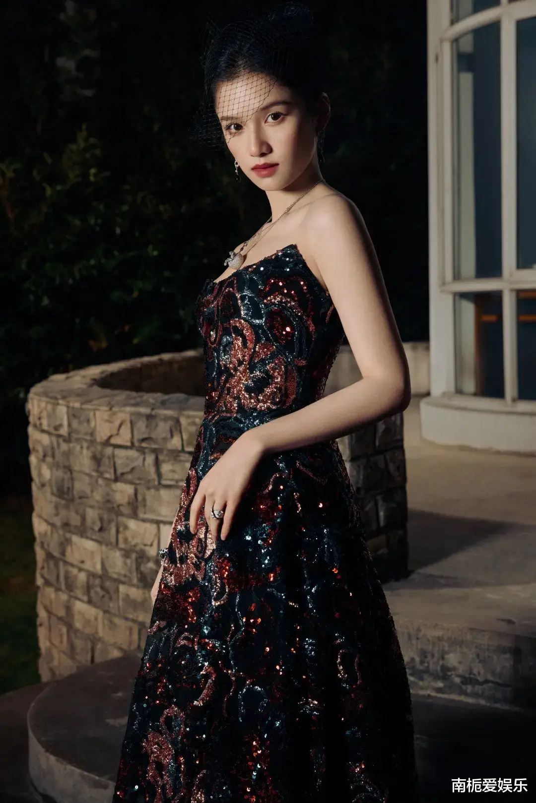 这身造型的精妙之处更在于细节的极致雕琢。裙身密布细如碎星的亮片与鎏金刺绣花朵,随步伐轻移,光晕如星轨般流转,被网友盛赞为“行走的暗夜牡丹”。当她提裙转身时,裙摆翻飞间亮片层层叠叠绽放,动静之间皆成画卷。露肩设计精准勾勒出她雕塑般的肩颈线条,搭配复古低盘发与半透明黑纱头饰,既保留了神秘滤镜,又平添几分古典名伶的优雅气韵,令人过目难忘。