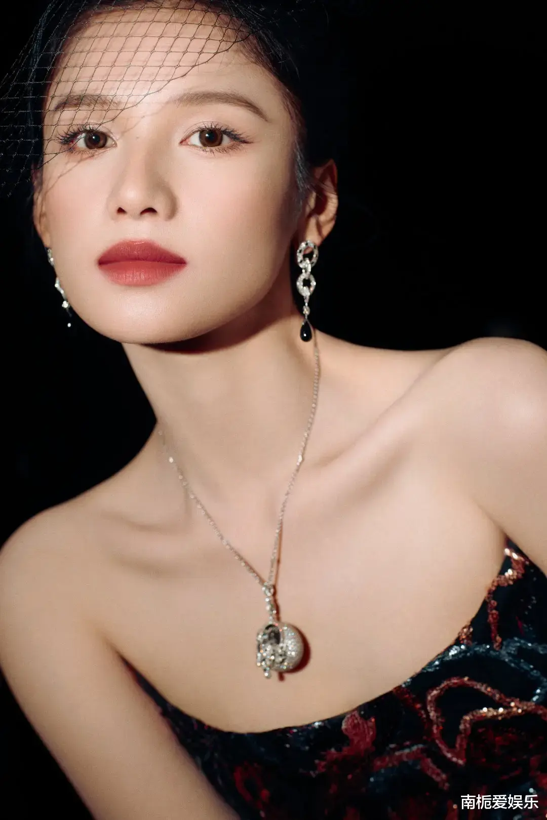 配饰与妆容的搭配亦堪称教科书级别。她佩戴的Cartier高级珠宝,钻石项链与耳饰散发冷冽光芒,与裙装暖调细闪形成巧妙呼应,低调却不失奢华,真正诠释了“贵气不张扬”的穿搭哲学。妆容上,烟熏眼影搭配眼尾一抹金色闪粉,复古红唇进一步凸显她明艳的骨相轮廓。即便在高清怼脸镜头下,她的皮肤状态与面部通透自然,毫无瑕疵。