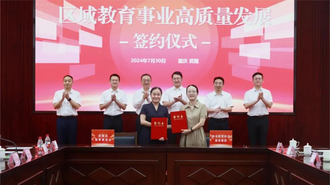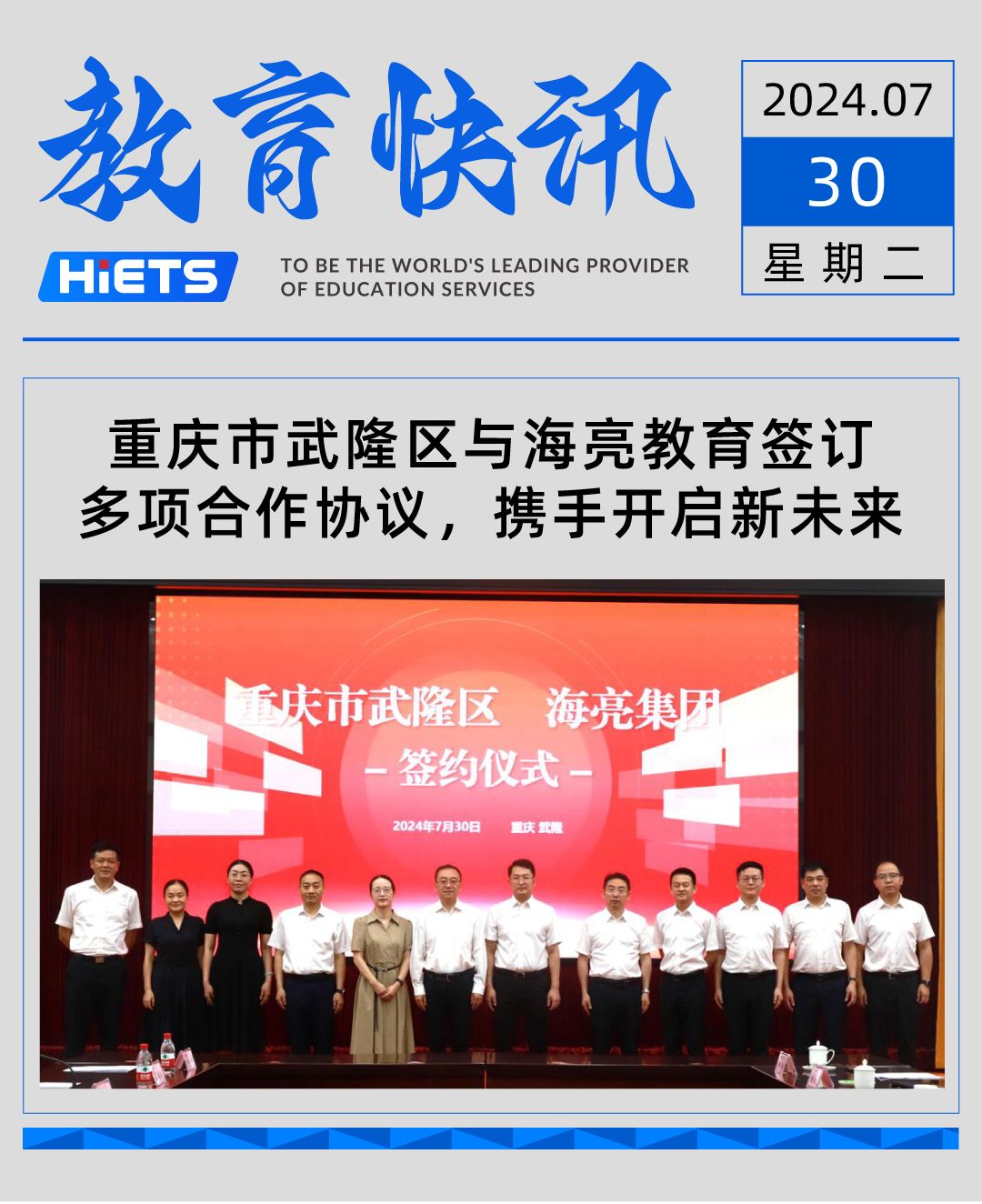 7月30日,重庆市武隆区人民政府与海亮教育科技服务集团举行区域教育事业高质量发展和研学及综合实践教育运营合作协议签约仪式。武隆区委书记何庆,区委副书记毛大春,区委常委、常务副区长刘高永,海亮教育科技服务集团董事长、总裁陈军伟,副总裁彭蕾、黄冠出席。武隆区政府副区长何圣春主持。