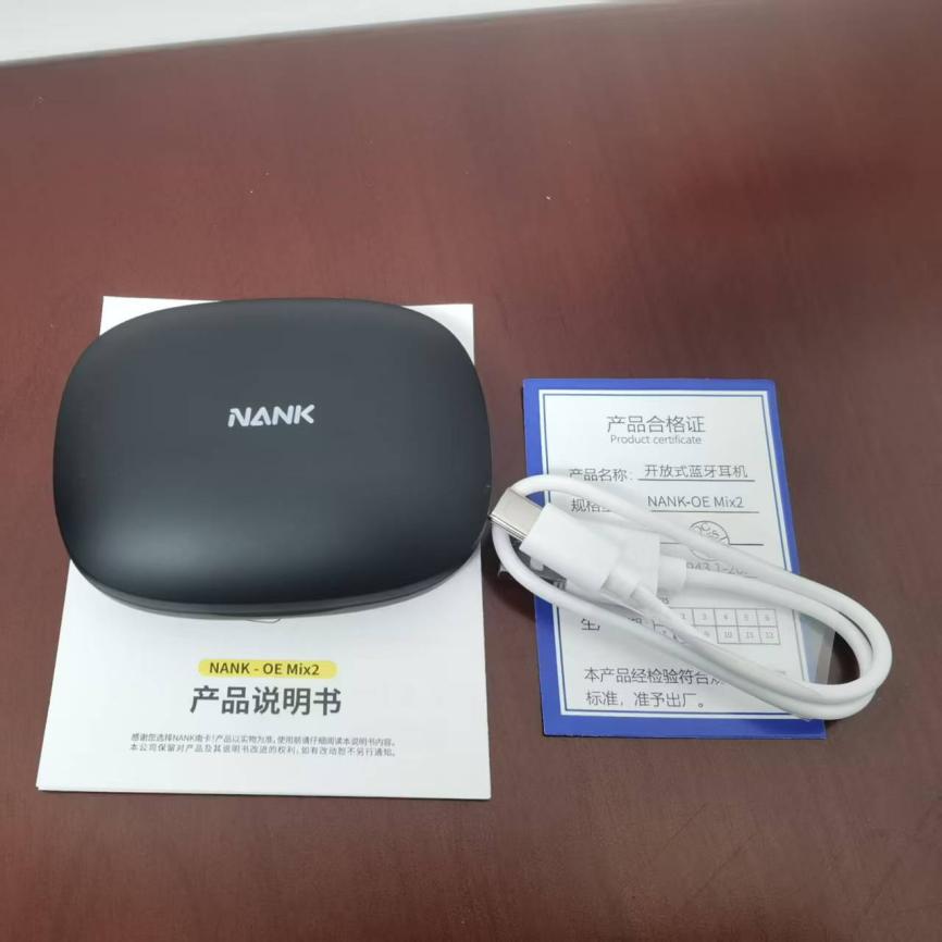 南卡OE MIX2包装内部有耳机主体、充电仓、一根Type-C充电线、说明书、合格证。