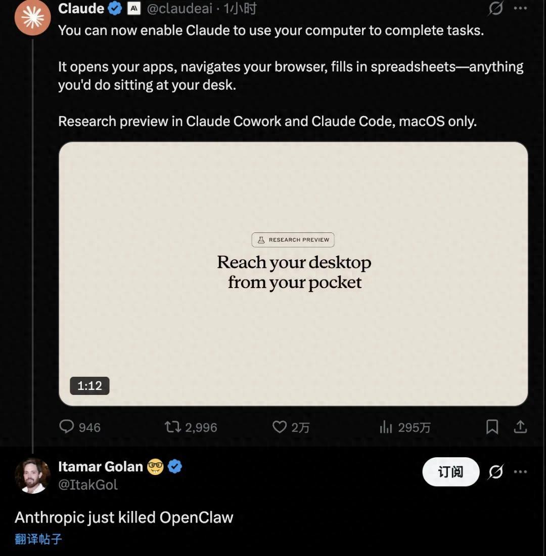 有网友感慨,开源的Openclaw很难跟上Anthropic公司全力开发的更新速度,尽管Openclaw已经是我见过更新最快的软件了。