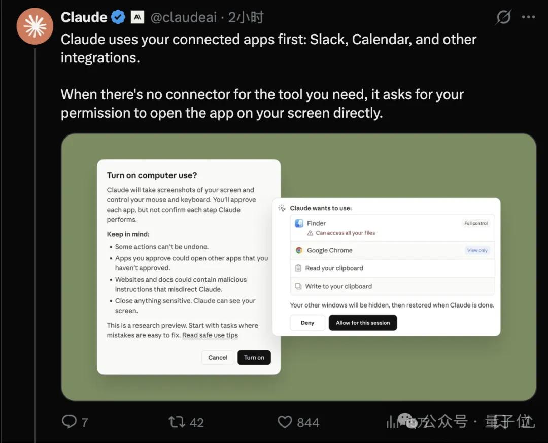 安全设计上也做了分层,Claude会优先调用已经授权过的集成能力(比如Slack、日历、Google Workspace等),只有当工具没有对应连接器的时候,才会申请操作桌面的权限。