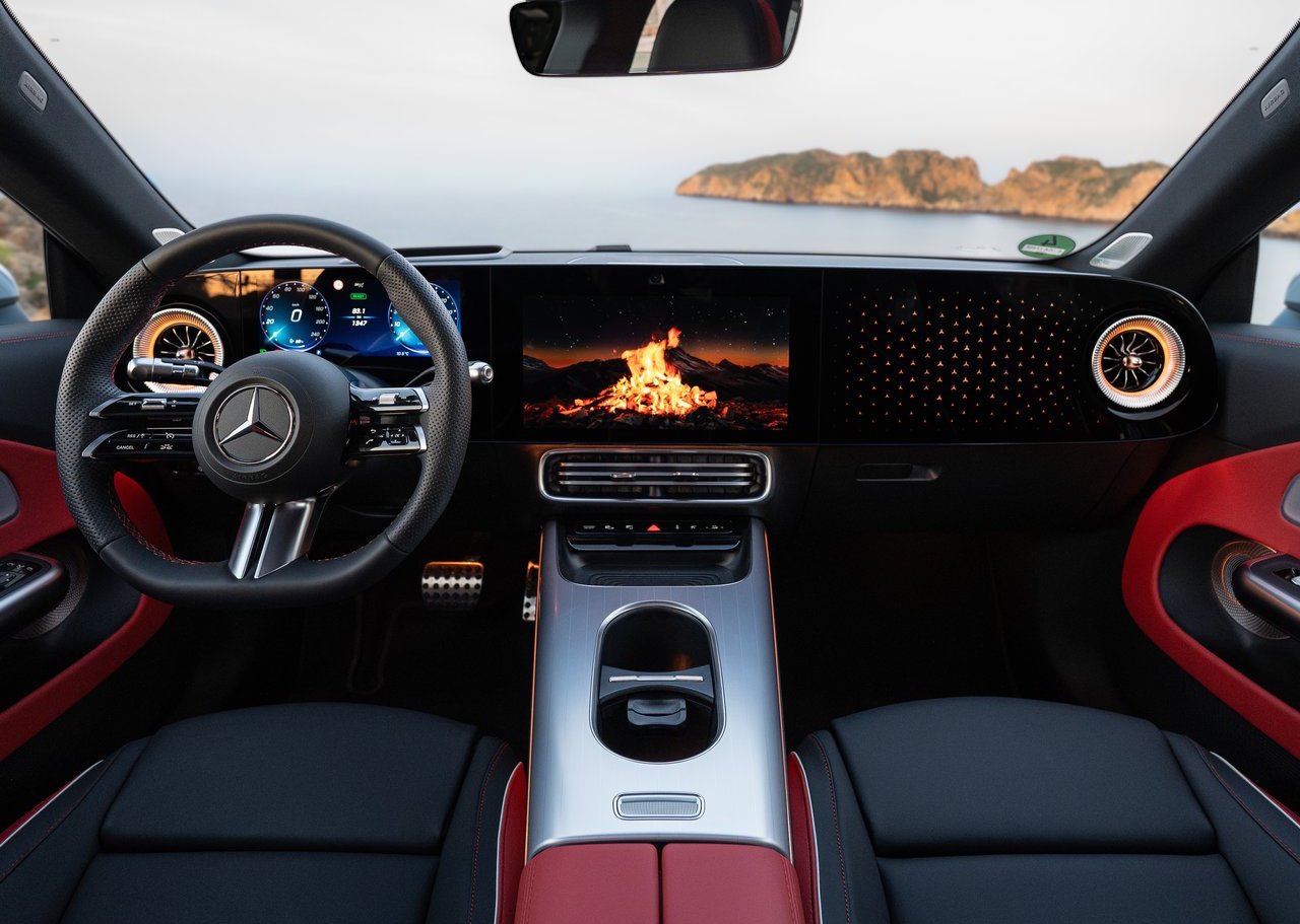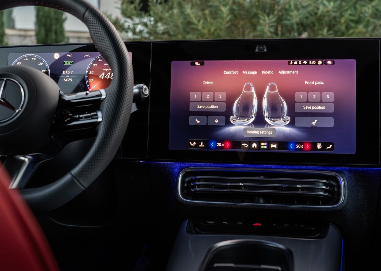 可选装的MBUX超联屏横贯整个座舱,玻璃面板下方集成10.25英寸)驾驶仪表屏与14英寸中控屏,前排乘客还可选装同款14英寸独立娱乐屏。车载应用生态持续拓展,涵盖视频流媒体平台。用户可连接蓝牙游戏手柄或手机畅享车载游戏体验,行驶中手柄可用于乘客屏,中控屏游戏仅在驻车时可开启。三块屏幕均搭载最新高性能芯片,由Unity游戏引擎提供实时图形渲染。