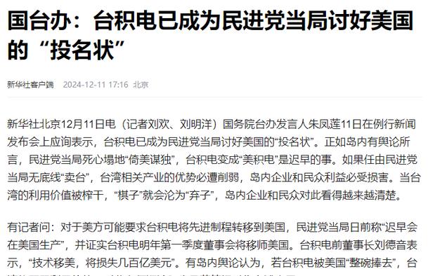 《国台办:台积电已成为民进党当局讨好美国的“投名状》新华社客户端2024-12-11