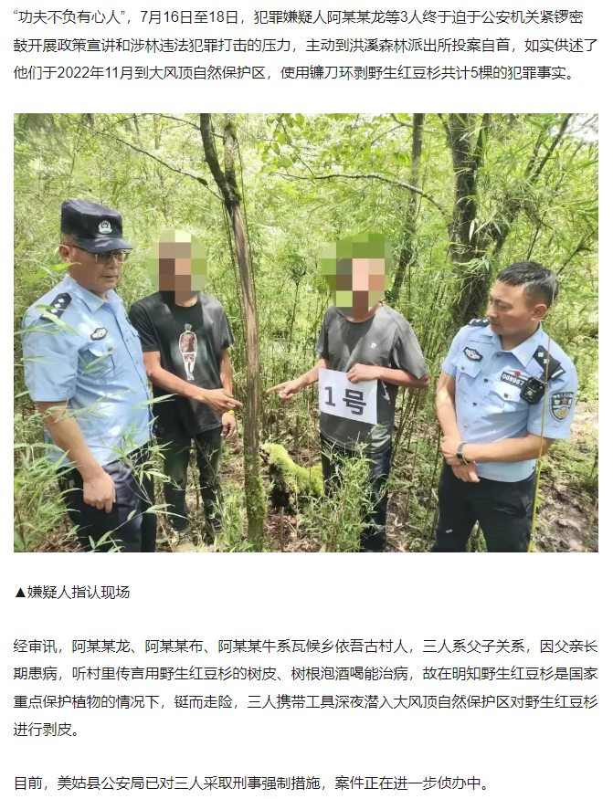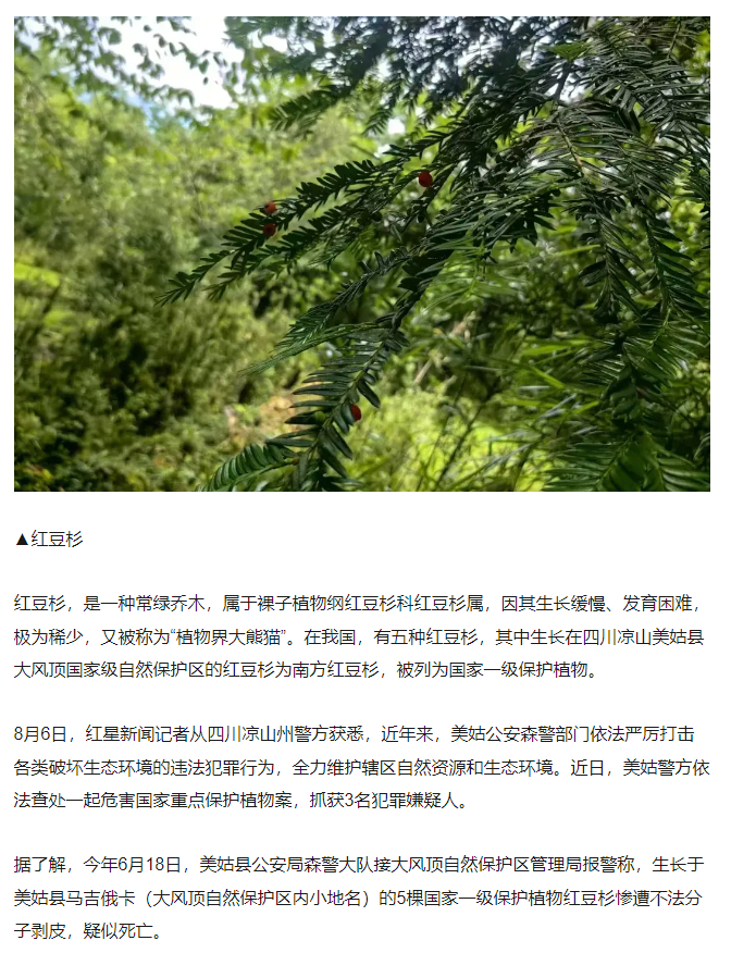 凉山5棵“植物界大熊猫”红豆杉惨遭剥皮:系国家一级保护植物,父子3人作案落网
