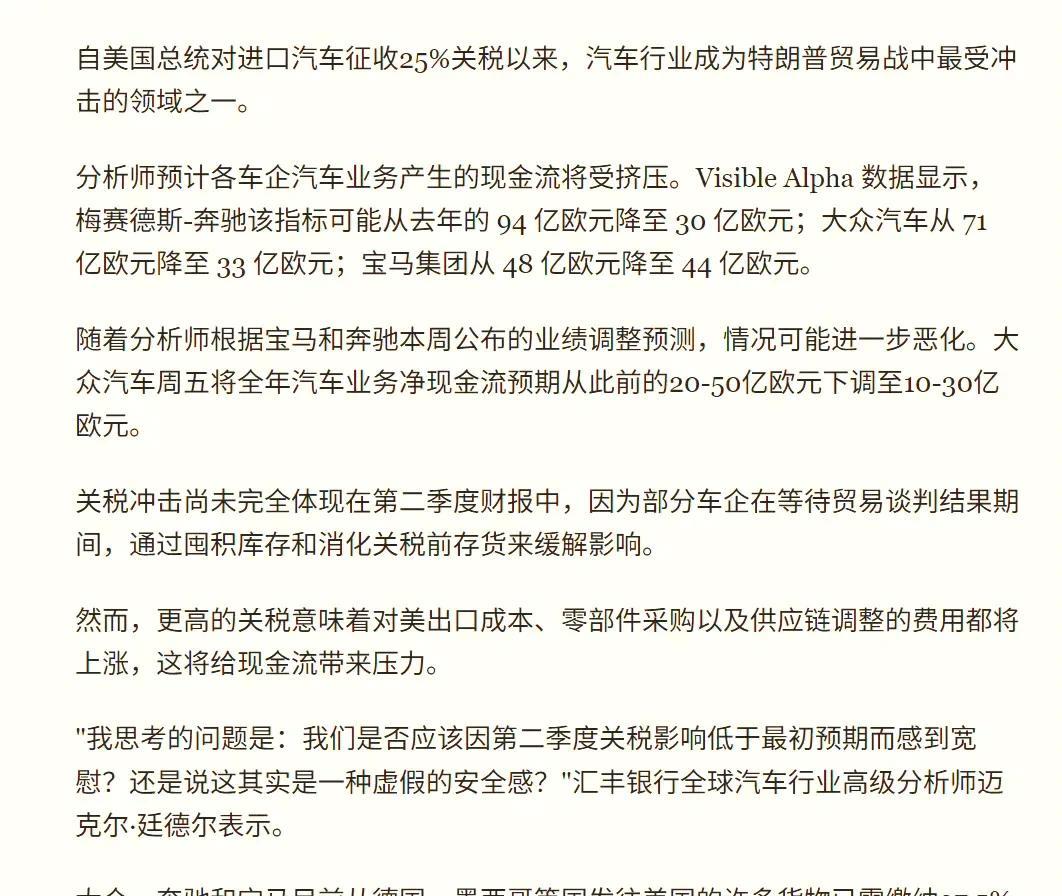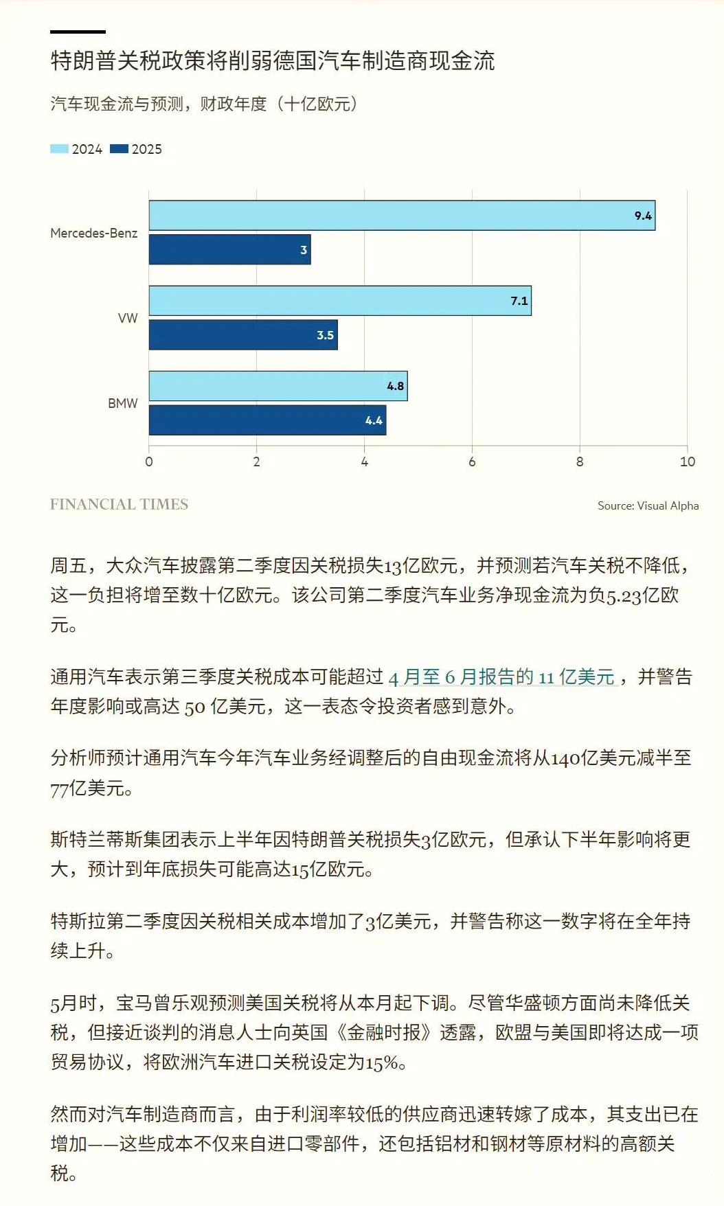 英国《金融时报》说:“德国汽车制造商因特朗普关税面临100亿欧元现金流冲击,更高