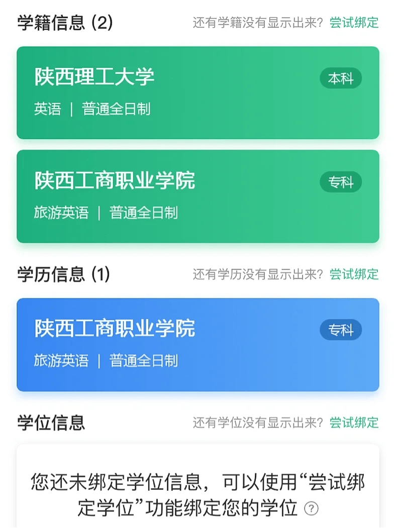 学信网显示如下图所示,毕业时学历信息本专科都显示了。