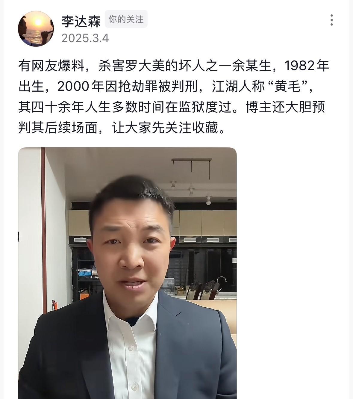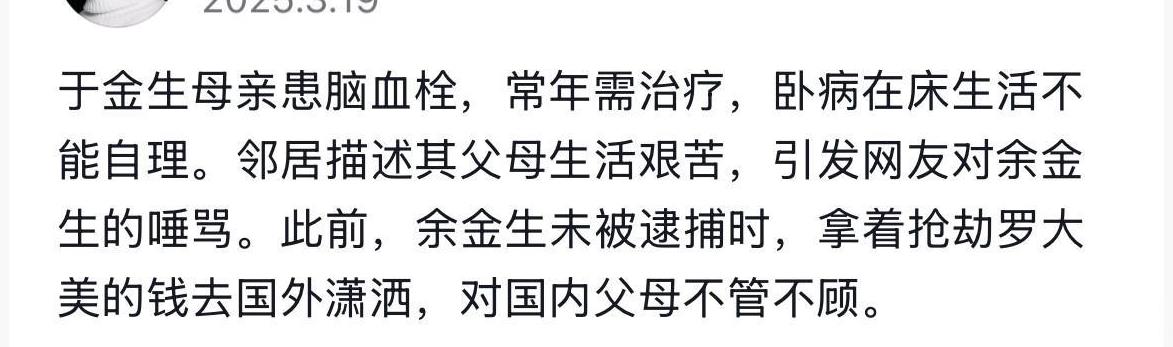 杀害罗大美前,主犯余金生已先后坐牢十来年!他1982年生,江湖人称“黄毛”。 他出生在一个普通的农村家庭,自小家庭贫困。可身为家中长子的他,却丝毫没有撑起自己肩上应有的责任。 十几岁时,他就开始混迹社会,不到 20岁时就因犯抢劫罪被判十余年,可出来后他仍不肯洗心革面,后来又因触法律被判4年。 可以这么说,他年轻的生命有很大一部分是在牢里度过的。按道理来说,他先后被两次劳教,一般人早已经被感化,可他却是变本加厉啊! 他母亲常年瘫痪,家里住着安置房,因没有固定生活来源,生活条件十分艰苦,可他不管不顾。[泪奔]大家都住在同城,可在平日生活里,父母连他人影子都见不到。住在隔壁多年的邻居,甚至都不知道他长什么样子! 他与在风月场所中工作的沙玉娇同居在一起,利用罗大美的同学杨恒把罗大美骗了出来。抢走了几百万,最终还要将罗大美残忍杀害。 如此有预谋的抢劫杀人案,他却当庭翻供!不仅以自己双亲年迈无人照顾、年幼的孩子嗷嗷待哺等借口打感情牌,还始终不承认故意杀人的事实! 余金生这种人真的是太可怕了! 事情发生前他对父母向来不管,结果到了庭审现场,却装出了孝子的模样。当意识到打感情牌无用时,马上就又变了一副模样。 面对公诉人的指控,他嚣张、蛮横的反驳公诉人:“罗大美死的时候,只有我自己在现场,你怎么知道是我杀的人?” 看到这些相关细节,真的是让人愤怒难了!但无论怎样,我们始终坚信正义会有到来的一天![祈祷][祈祷] #头号创作者激励计划#