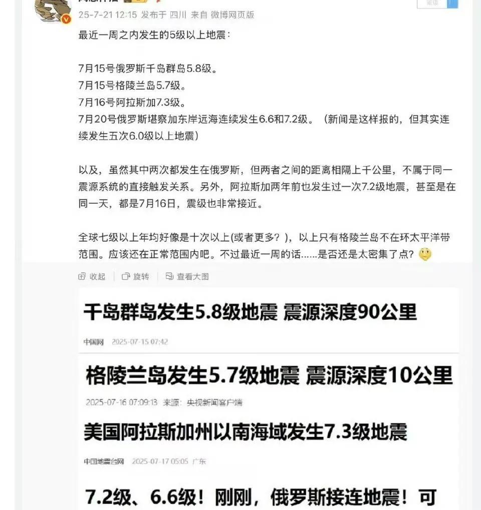 俄罗斯8.7级地震,日本真该慌了! 用deepseek查了一下,8.7级地震的能量相当于4万颗广岛原子弹爆炸的能量,非常恐怖。但是与2011年日本九级地震相比,产生的能量还是小了很多,只有那次的14%。 日本一个岛国,距离俄罗斯这次强地震很近,据说日本海岸全线都有影响,今天730,明天731,大自然也要玩这种巧合吗? 今年七月以来,全球已经发生多起七级以上地震,如果真的严重到波及到日本全岛,谁都救不了他们。