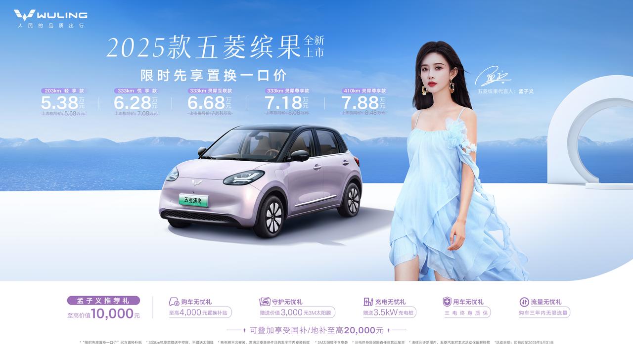 2025款五菱缤果上市,孟子义助阵,现场竟成了音乐会? 4月19日,2025款缤果上市,限时先享置换一口价5.38-7.88万元,这样把上市发布会现场搞成音乐节还是第一次见,并且孟子义在现场亲自助阵,五菱这次让我们见到新奇事物了,不愧是A0级纯电代步车的标杆。 2025款五菱缤果将“标杆”这一属性进行了加强,因为它升级的地方还不少,有芋泥紫、海盐蓝、奶酪白、奶咖白四款缤纷幻彩车色,更符合小姐姐们的审美了,怪不得请孟子义代言,原来它的外观自带女神属性。 它的内饰也进行了升级,采用焦糖咖和果壳棕两种拼色,坐进去就很温馨的感觉。2025款缤果的储物空间大幅提升,前侧扶手位置增加了一个大储物格,前排乘客置物更方便,上方还有一个专属手机槽,内部整体有17处储物空间。 2025款缤果采用了更便捷的怀挡,手不用离开方向盘就可操作,更受女性消费者欢迎。它还增加了360°全景影像,泊车的时候可以对车外环境更好的把握,对前后车的距离判断也更精准,可以更快速的完成泊车。 2025款的缤果保持了续航上的优势,达到了410km,还配备快充,35分钟就可以将电量从30%充至80%,因此拿它来代步或者长途出行都没有问题。毫无疑问,2025款缤果作为标杆车型,将会继续引领代步车市场的发展。
