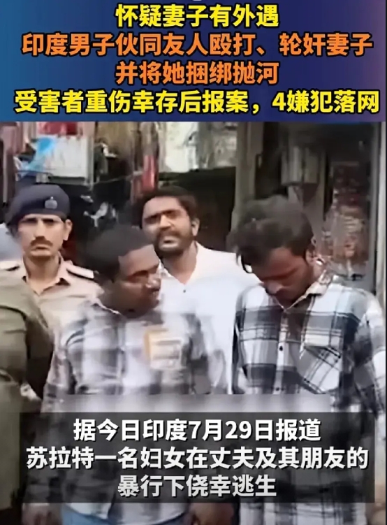 一名印度男子怀疑自己妻子有外遇,心生怨气,于是就找了自己一个朋友,两人一块把妻子从家中绑架到了出租屋里,先是对妻子进行了棍棒教育,然后又对她实施了轮j。 做完这些后他仍觉得不解气,于是又叫了两个朋友(这样的人朋友还不少呢),四个男人用三轮车把妻子运到了河边,然后扔到了河里! 也许是命不该绝,重伤的妻子并没有被淹死,侥幸活了下来,恢复体力后她果断去报了警,在印度警方的努力下,包括她丈夫在内的4名嫌犯全部被抓! 发生这样的事让人很难理解,也许是个别印度人的做法带偏了人们对印度的整体看法,大家还是理理性看待这件事吧!