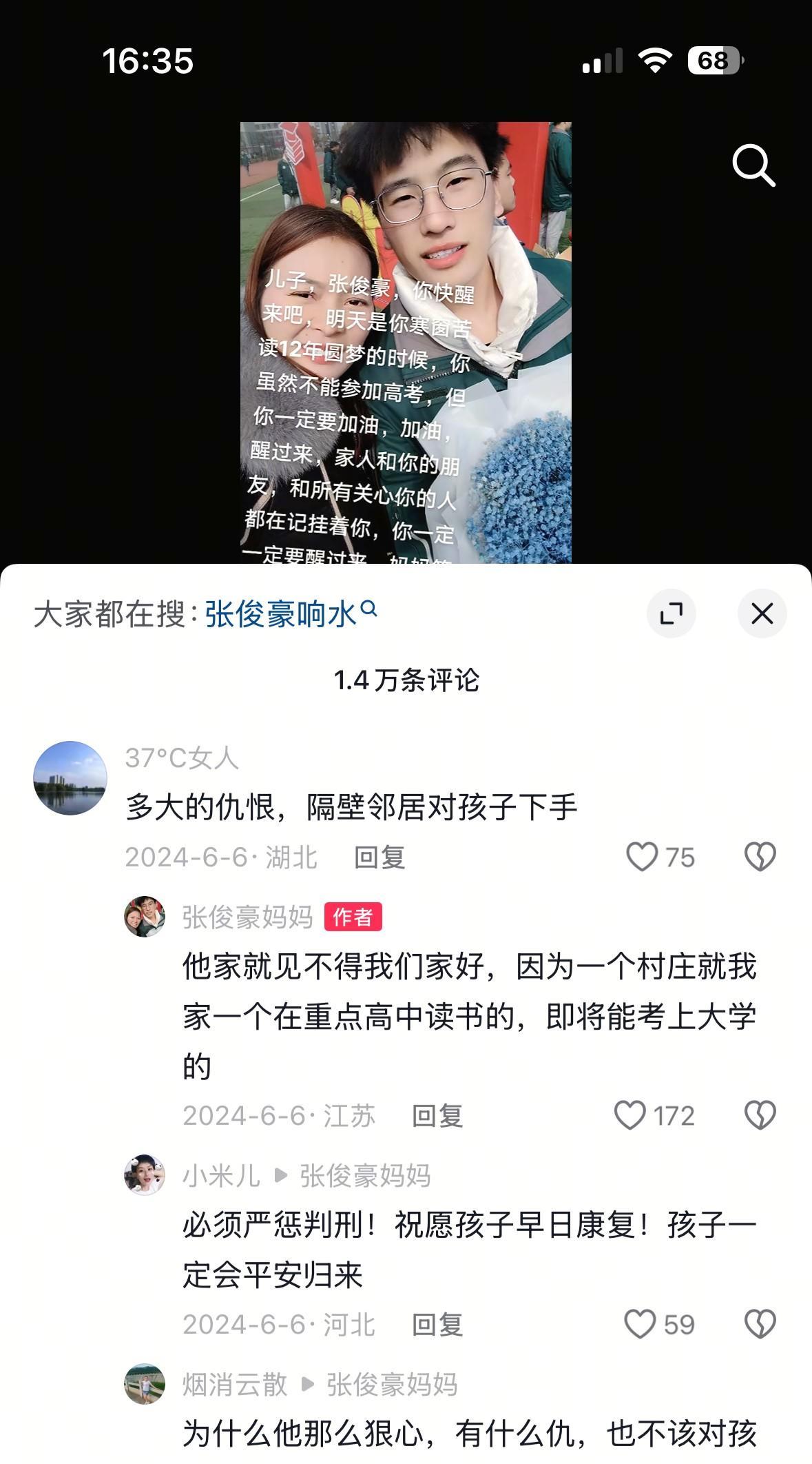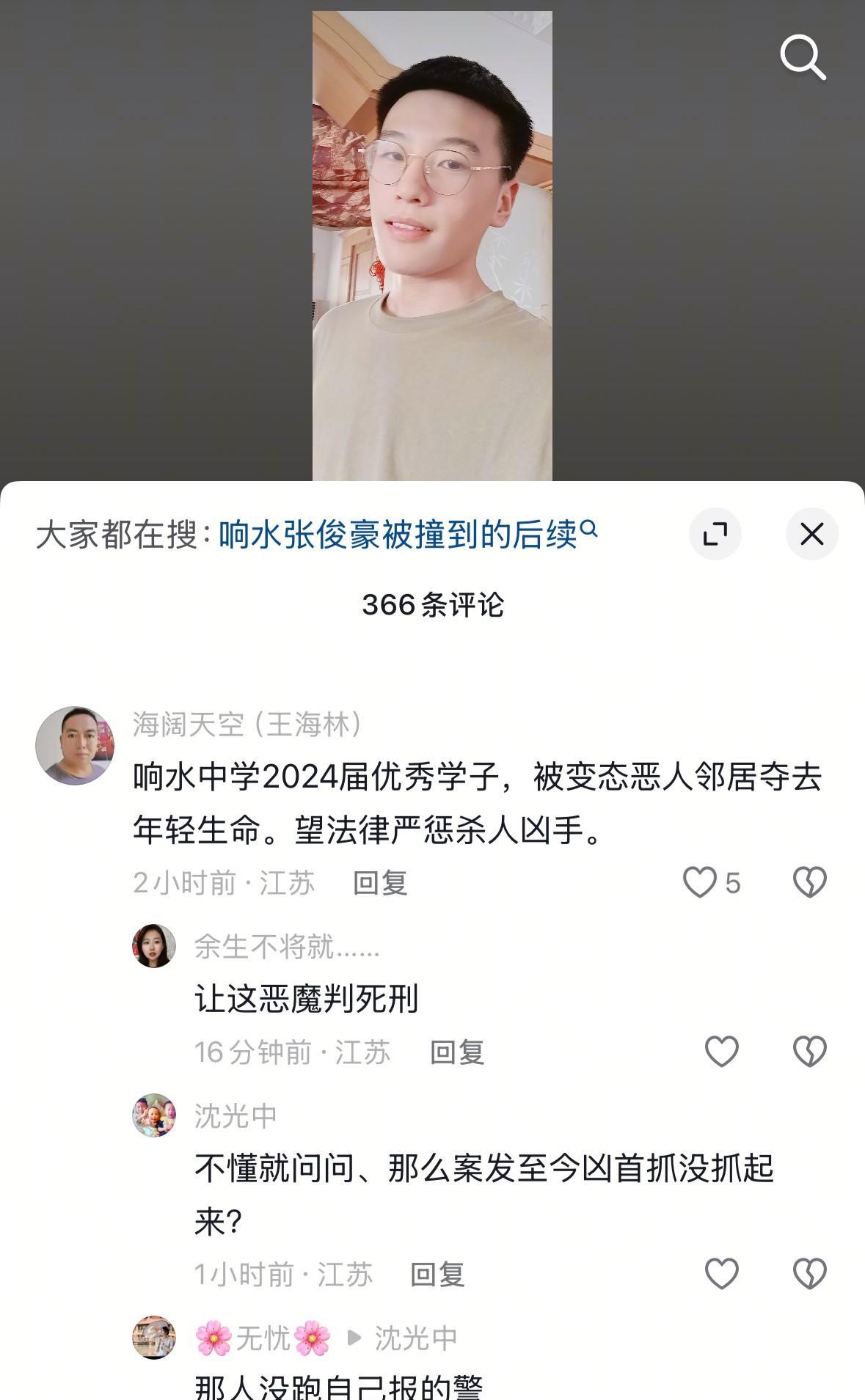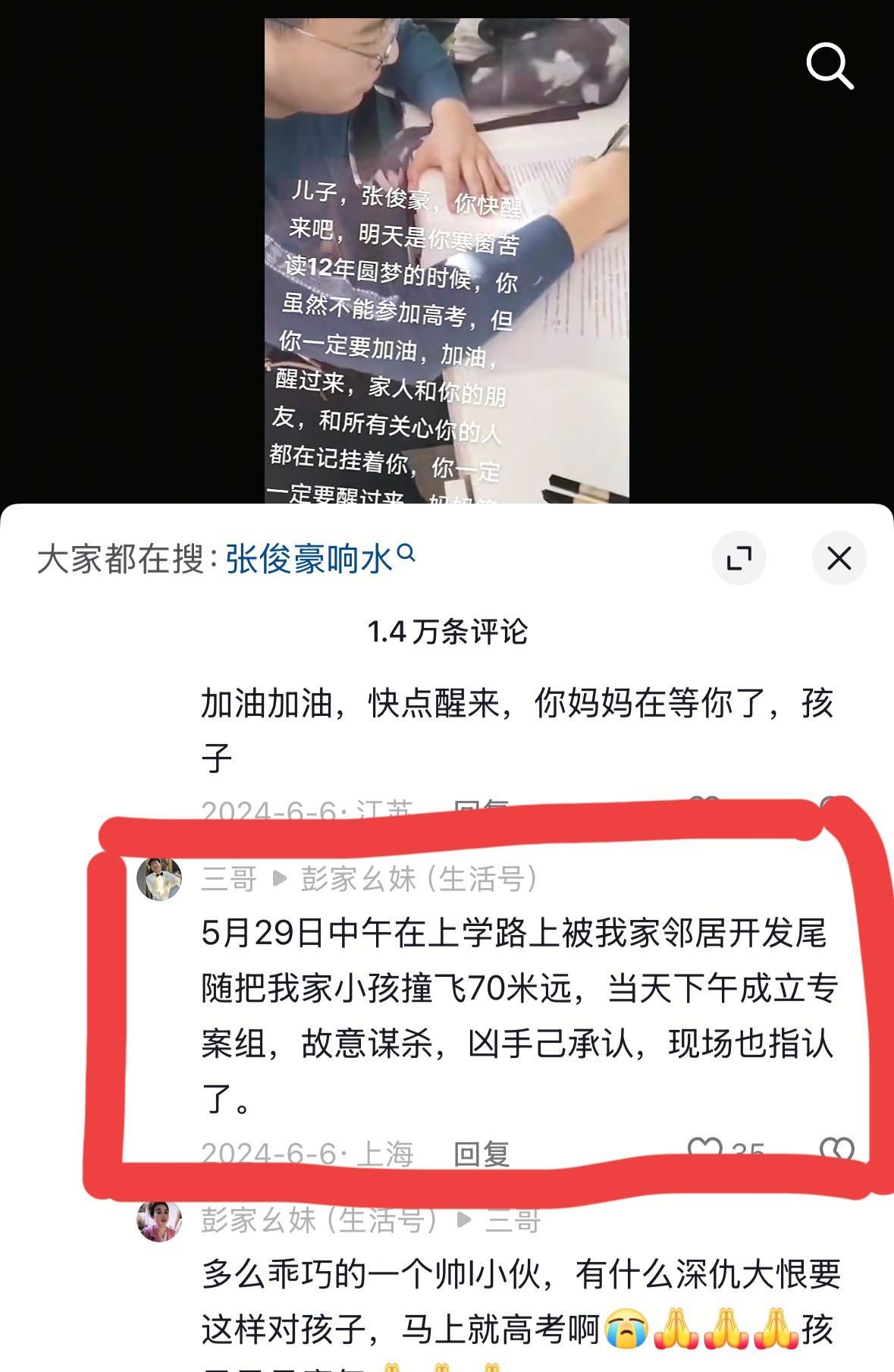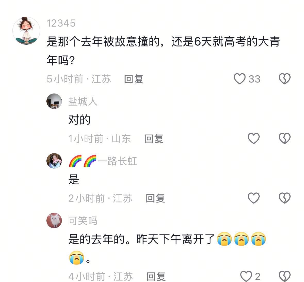 无比悲痛![泣不成声]那个被邻居撞飞70米的江苏响水学霸张俊豪永远离开了!被撞后,他成为了植物人,昏迷不醒一年后,在7月29日永远离开了! 这个叫张俊豪的男孩是2005年出生的,他自小品学兼优,是响水重点中学的高三学生学生。 高中三年,他非常努力,一直在为自己的梦想而努力,因为他想要报考军校。可是,万万想不到,在高考前几天一个邻居彻底毁掉了他的人生。 看了事情的来龙去脉,心里满满的心疼。 2024年5月29日中午,张俊豪在上学途中快步走着,突然,一辆车子疾驰赶来。张俊豪还没来得及明白发生了什么,人就被撞飞了。 由于颅脑损伤严重,张俊豪再也没有醒过来,他心心念念的高考日也在昏迷度过了。 撞伤他的人,是和他一个村的邻居,对方只比他大5岁而已!原本大家都是同龄人,按道理来说是有共同话题的玩伴。但因为张俊豪成绩很好,那个邻居就一直看不惯他。可谁也没想到,他最后竟然会做出那样的事情。 悲剧发生后,虽然邻居被捕,但张俊豪的人生再也回不来了。纵使父母倾家荡产救治他,但情况始终没有任何好转。 一年的时间里,张俊豪就那么静静的躺着,他没有机会和家人说一句话,更没有机会睁开眼睛看看的家人,生命便永远的停留在了20岁这一年! 如果没有那个邻居,他现在一定是在自己喜欢的大学里驰骋翱翔啊![祈祷][祈祷][祈祷][流泪] #头号创作者激励计划#