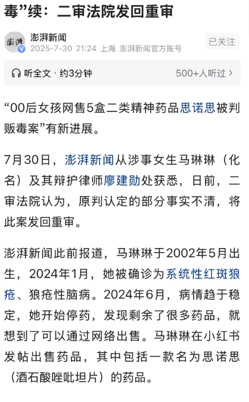 据澎湃新闻7月30日报道:马琳琳怎么也没想到,自己只是本着不浪费的原则,把自己吃剩的药品转手卖点钱,却因为自己的无知,惹上了牢狱之灾。
