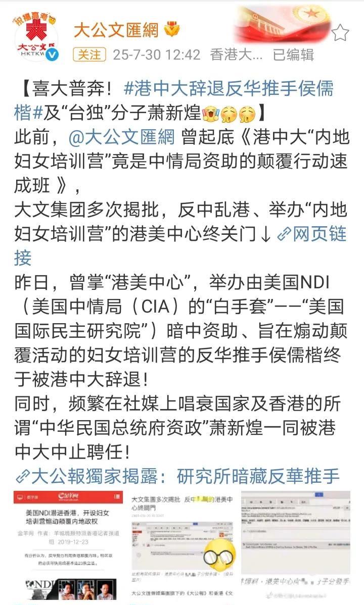 香港某大学内设机构实为美国CAI暗中资助,长期招募培训内地年轻妇女! 消息来源:香港大公报 7月30日大公报连发两篇文章庆祝港中大辞退“反华推手”侯儒楷及“台独”分子萧新煌! 侯儒楷曾执掌过港中大一个培训机构,而该机构大公报以前就揭露过真面目! 此前大公报发文起底港中大的“内地妇女培训营”,该机构打着“学术交流”的幌子,实则一直干着违法乱纪的事,它就是一个美国中情局暗中资助的NGO组织! 据大公报的报道,去该机构培训时间跨度为4个月,不仅不用交钱,反而该机构会给每名学员一万港元的经费! 目前该机构和负责人纷纷倒闭辞退,但我想问问:那些从此培训机构出来的年轻学员,有关部门是不是应该去找找看,她们这些人现在都在哪里工作学习?是不是还和该机构藕断丝连?