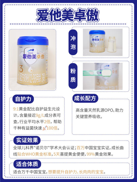 爱他美卓傲扒开成分表一看,各项指标直接拉满,妥妥的六边形战神!喝到现在,体检单上的生长曲线一路狂飙,小胳膊小腿肉乎乎的超有劲儿,带出门都被追着问喂养秘籍!还在纠结三段奶粉的宝妈,闭眼入这款准没错