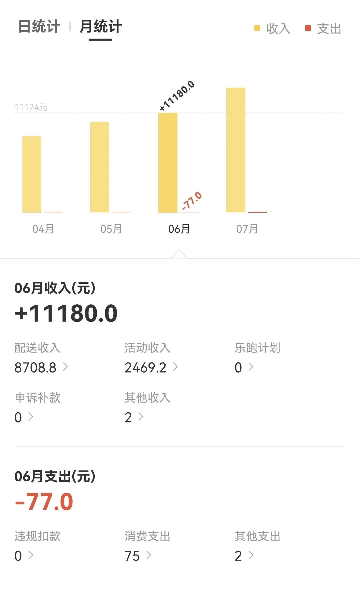 今天是7月31日,7月最后一天!忙忙碌碌一个月,这个月跑了13988元,比6月份多了三千元!奖金7月份比6月份多了一千多,跑单的钱也比6月份多了一千多!7月份因为有这一个礼拜奖450元的活动,为了拿这450元,每天必须努力跑单,这样单量上去了,自然钱就多了! 虽然这个月多了几千元,但一个人还是感觉累!回到家都不想动了! 以前每天跑50单,现在每天多20单,这单量也是要爬很多楼梯,所以我现在接单尽量接低楼层,电梯单!鞋子换了双鸿星尔克的运动员,穿着不费脚,减少脚的压力! 明天就是8月份了,继续努力加油干吧!#月跑量# #七月跑量# #7月份的收益#