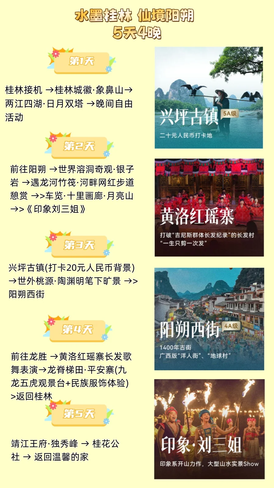 近赏·象鼻山→漫游·两江四湖→民俗·黄洛红瑶寨→登山·龙脊梯田→留影·九龙五虎观景台→竹筏·遇龙河→漫步·兴坪古镇→车览·十里画廊→探洞·银子岩→剧场 ·《印象刘三姐》→趣游·阳朔西街→赏玩·桂花公社