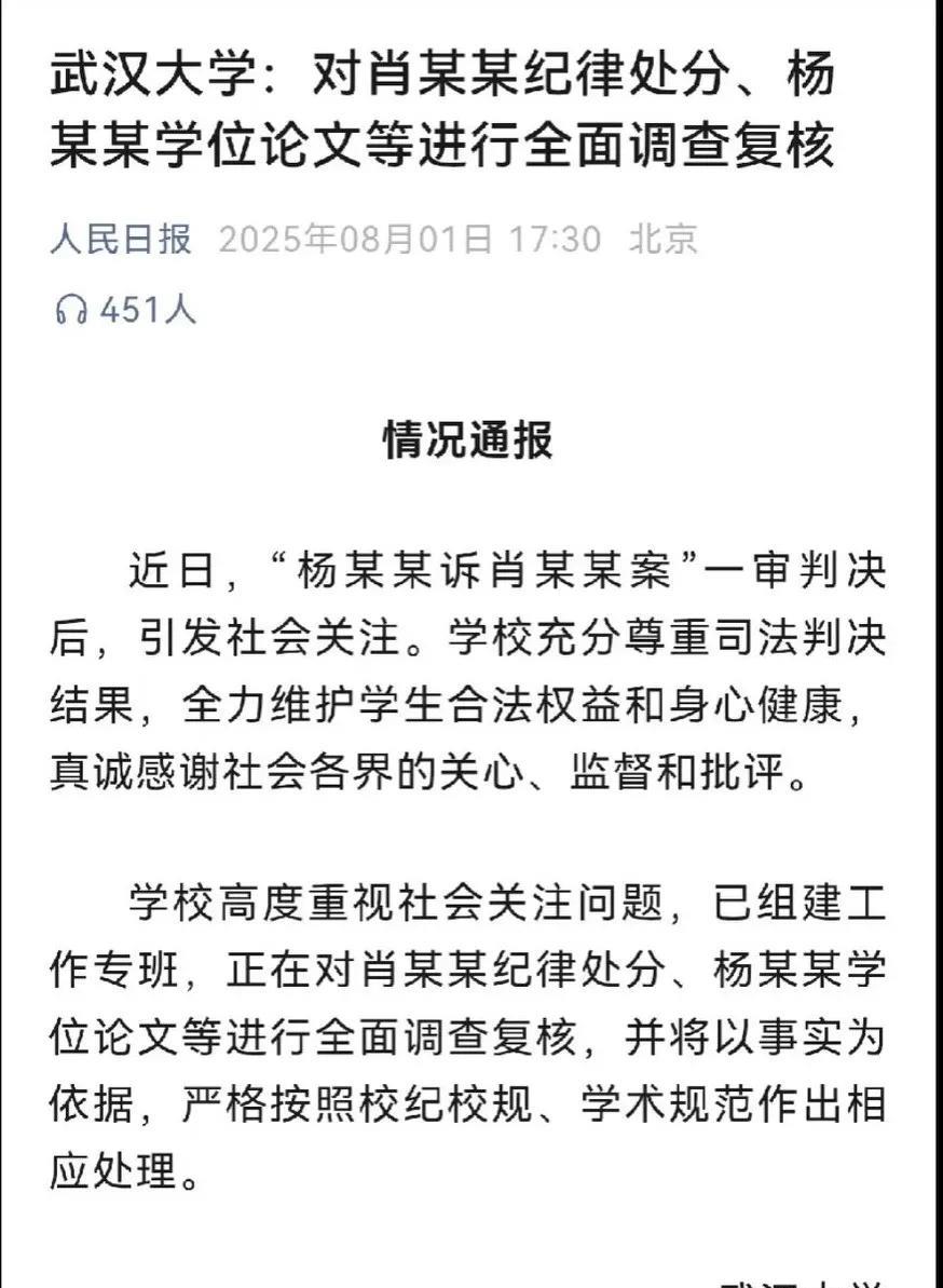 这把杨同学的黑眼圈更得深了!武大已经出通报了,要重新查!包括肖同学的处罚和杨同学