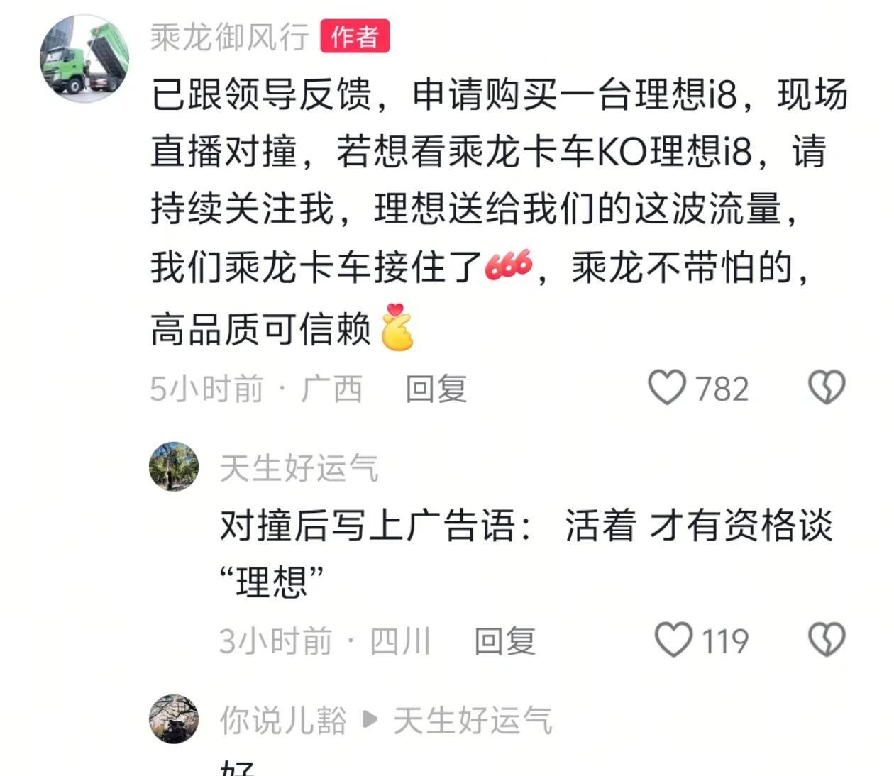不愧是央企,说话就是有底气!乘龙卡车玩真的了,现在只等理想i8开始交付,就会拿着新车进行对撞试验,虽然在大家的常识印象中,2吨重的汽车不可能把8吨的卡车撞飞,但毕竟没有实测过,没有足够的说服力! 乘龙卡车的工作人员说,理想拿来做测试的那款车,车头是通过液压锁住的,还有碰撞后移的安全设计,所以正常情况下车头根本不可能往前翻,所以他不理解为什么会出现这样的情况。 理想惹谁不好去惹柳汽,现在柳州正是艰难的时刻,刚被取消了地铁,要是支柱产业又被影响,那可真惨了! 不过也有网友出主意,说根本不用这么麻烦,搞得大费周章,建议乘龙卡车的公关部,直接一次性买十几台理想i8,免费送给北京上海广州最著名的殡仪馆当殡葬车,这点子简直绝了!