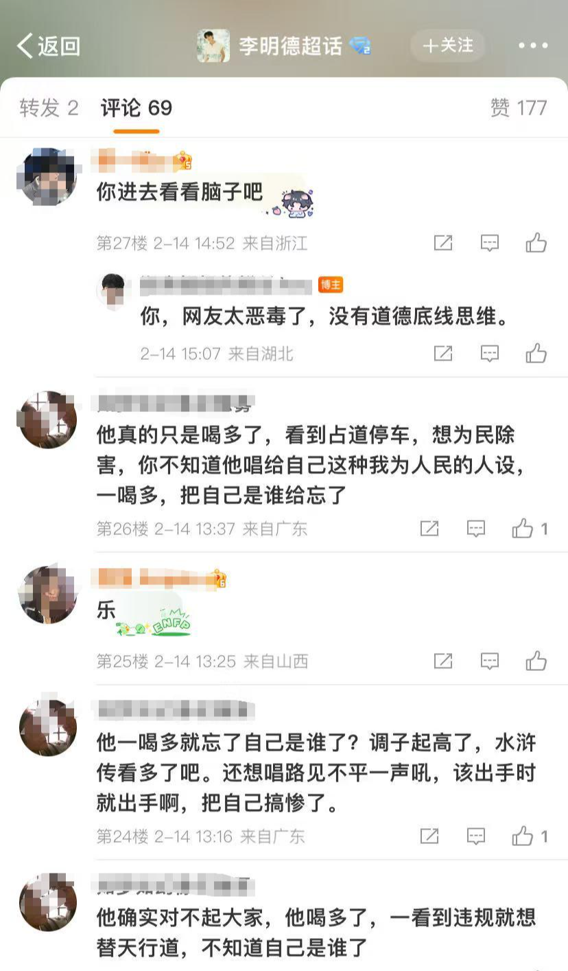 在李明德的超话中,有粉丝表示“他只是喝多了,看到占道停车想为民除害”,看到这种言论,我也是被惊到了,违法就是违法为什么还会有人给他辩解啊。