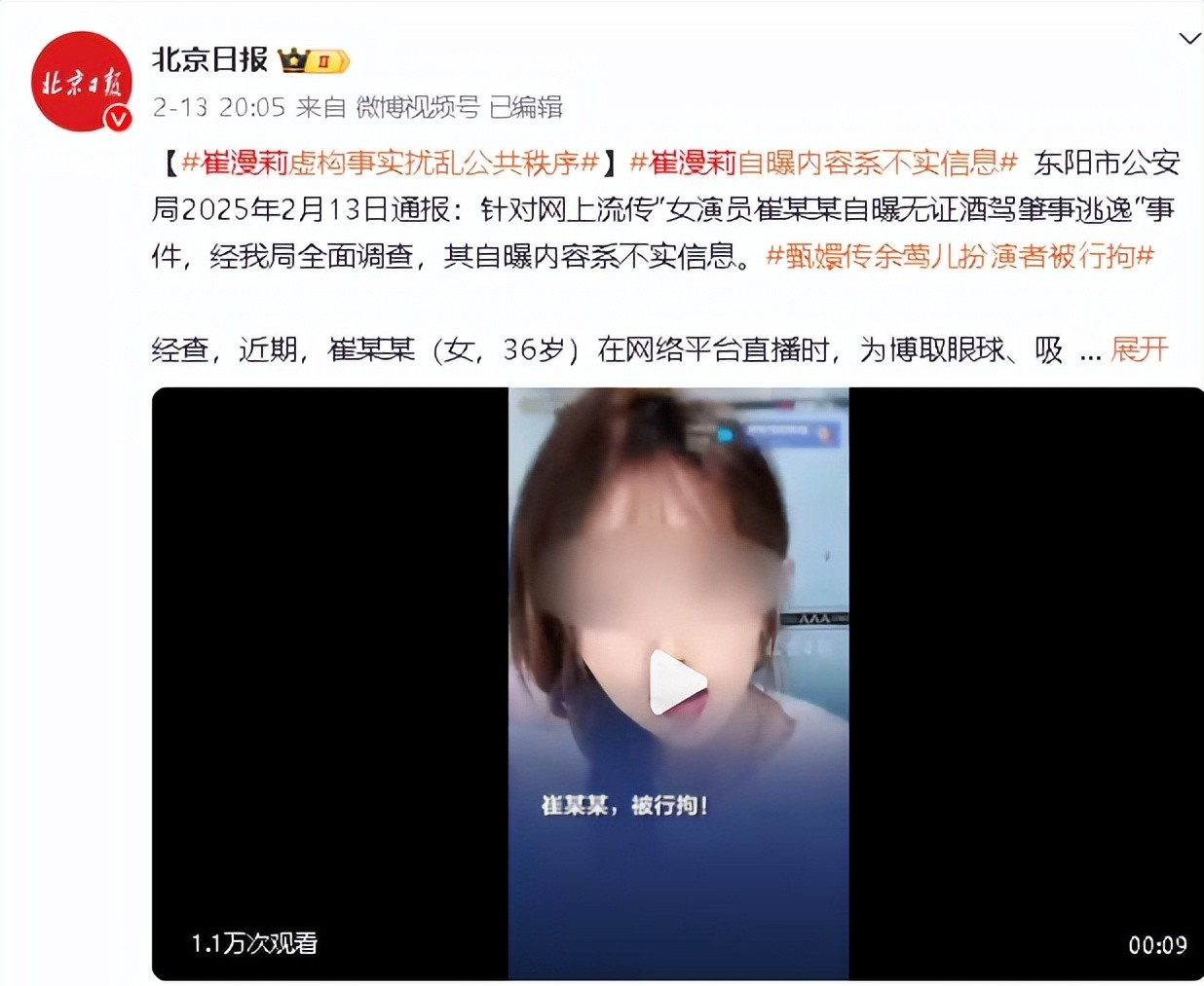 2月13日,浙江省东阳市公安局发布警情通报,崔某某因虚构事实扰乱公共秩序,违反《中华人民共和国治安管理处罚法》相关规定,已被该局依法予以行政拘留。