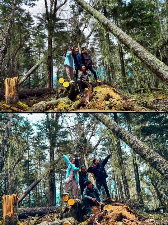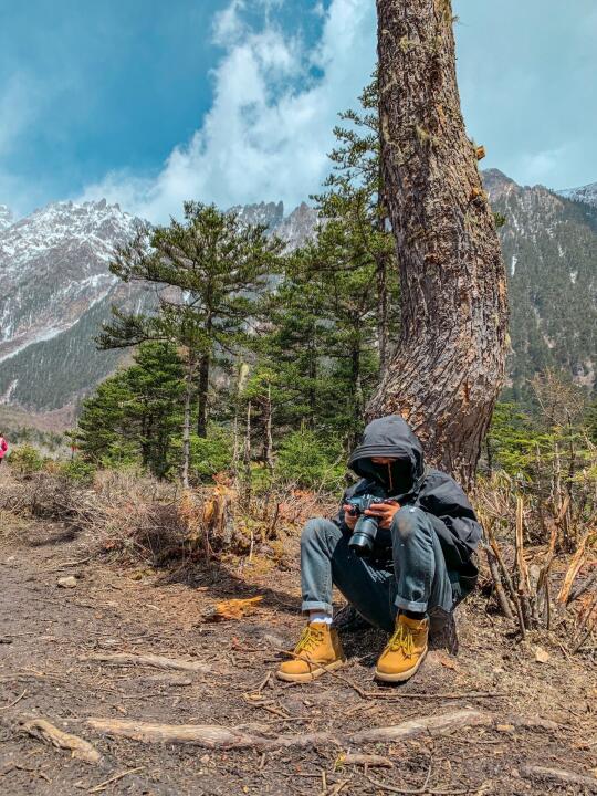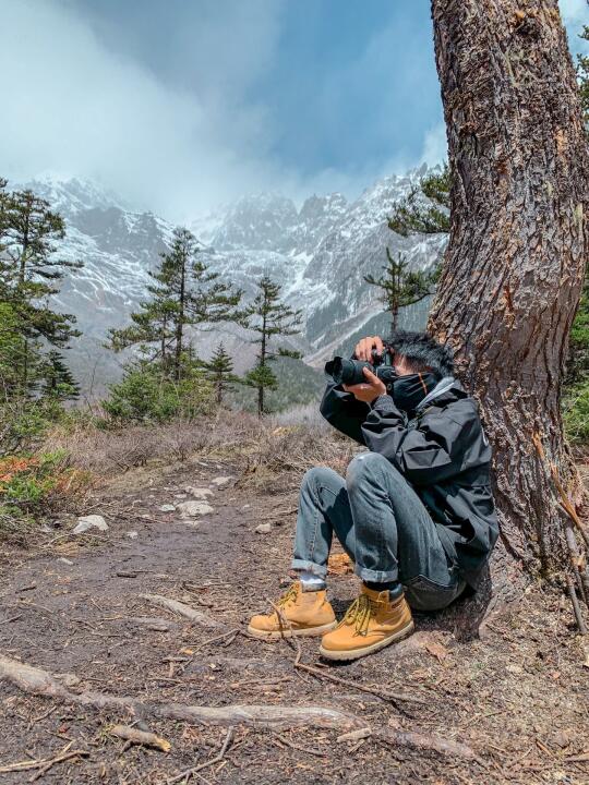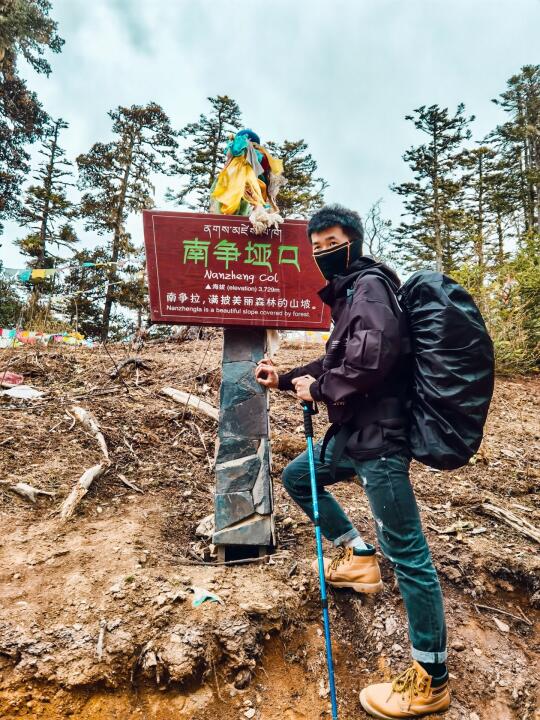 与他们的第一次邂逅,是因为我当时徒步进雨崩的时候,身后传来铜铃般响彻整条马路的笑声,那个女孩背着比自己身体还宽的包、一手执着登山杖一手还拎着一大包零食。祝祝(首图左2),重庆女孩儿,曾经攀登过四姑娘山2峰,超级喜欢笑,开朗的笑声能感染人。