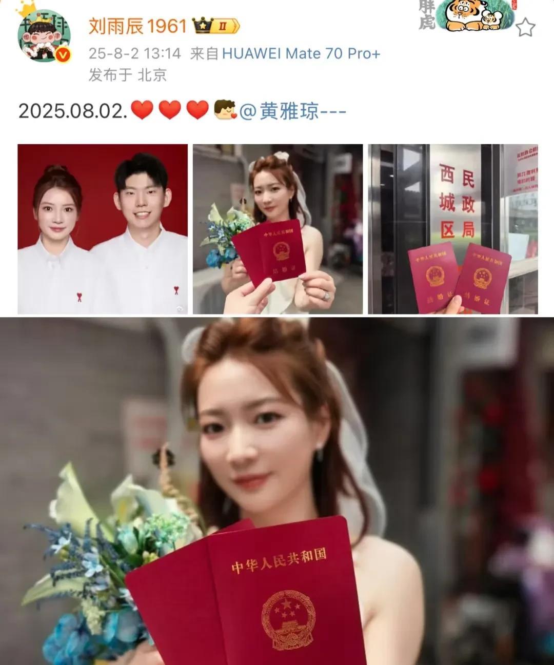 黄雅琼刘雨辰官宣领结婚证啦,幸福! 今天既是巴黎夺冠日,还是求婚纪念日,又是结婚纪念日,祝福他们俩永远幸福,黄雅琼真的好美啊,这个妆造特别适合她,看到有网友说好奇星期六还可以领结婚证,然后大家说一般周六也可以登记结婚,但是不办其他业务。 今天两个人卡点发文,晒出了他们的结婚证,平时两个人也会一起去旅行,也都见了双方家长,看着在一起很幸福。看到有网友说:“哇,这浪漫的日子,求婚和领证是同一天。” 时间过得真快啊,巴黎奥运会都过去一年了,还记得那天刘雨辰向黄雅琼求婚,黄雅琼还感动的哭了,一年后,俩人也终于领证,修成正果,网友们也纷纷送上祝福!