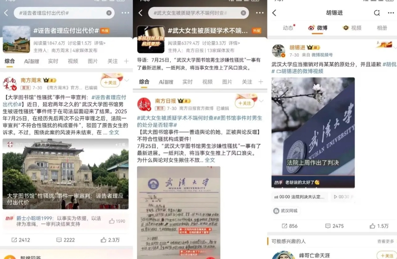 而更激怒公众的是,疑似官方账号还被指在法院宣判后发布了诸多暗示岁月静好、内涵隐喻的的内容,这也成为激怒舆论的又一把导火索。与此同时,诬告事件发起人杨某某,在法院宣判后在互联网讽刺网民、炫耀自己学业上升成功、讥讽要在日后持续举报男方的各种泯灭人性的言论,不仅给公众带来了情感挑衅,更突破社会道德底线。武汉大学部分人员与涉事诬告女生杨某某的傲慢态度,是这场舆论风波背后源源不断灌入的燃料,使得公众的怒火越发猛烈。