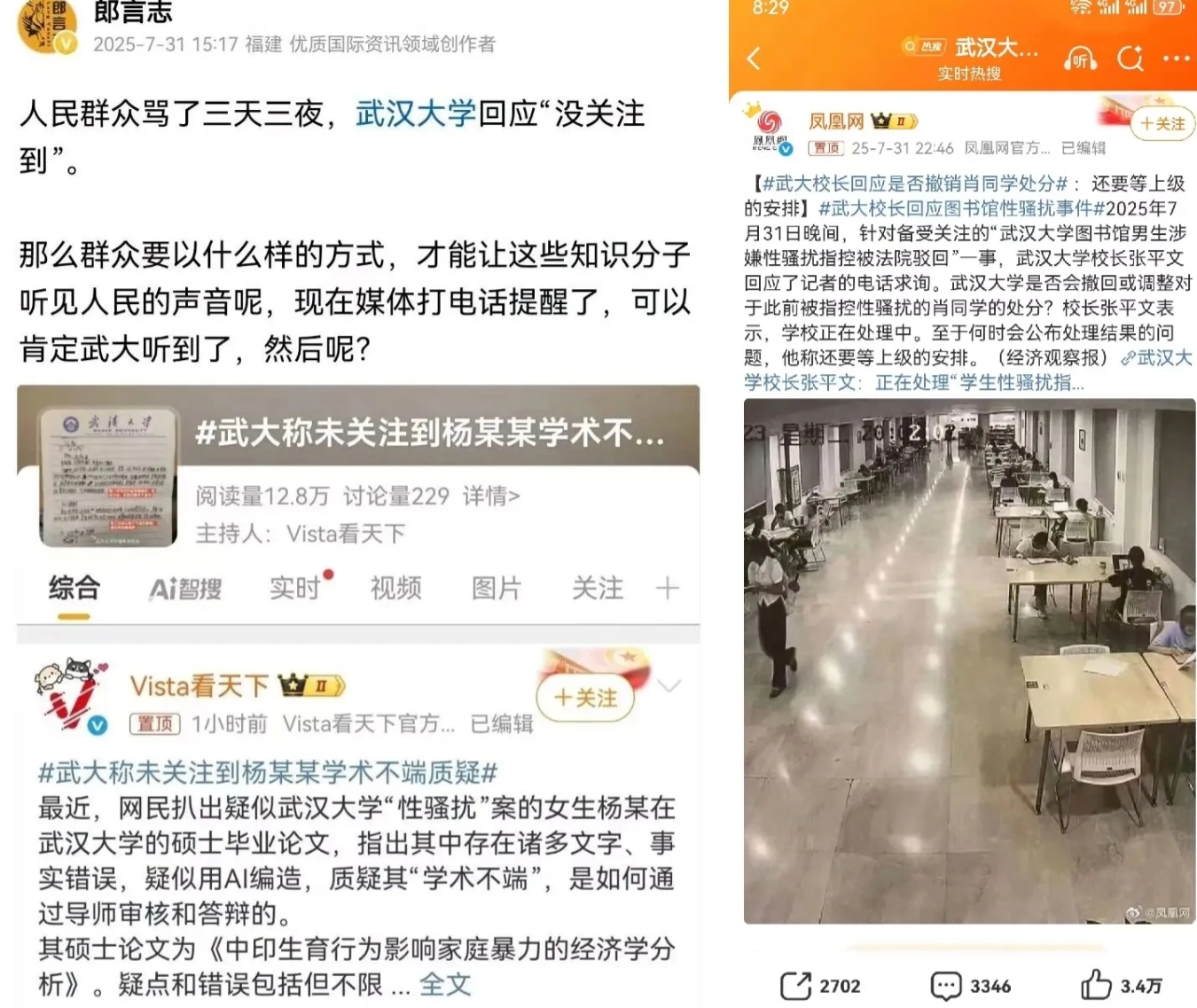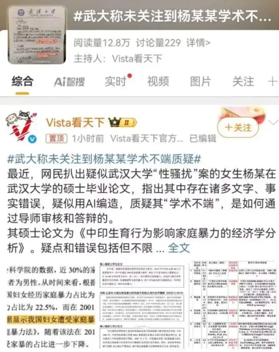 在针对“图书馆性骚扰诬告事件”展开的争论过程中,一些诸如诬告方杨某某毕业论文涉及抄袭、捏造等学术不端行为、武汉大学早期处置程序不正义、学校内部多次被曝有极端女权宣传活动等问题被爆出,甚至被网民挖掘出一些潜在的敏感问题。这些衍生问题,也成为了武大此次负面舆情的助燃剂。