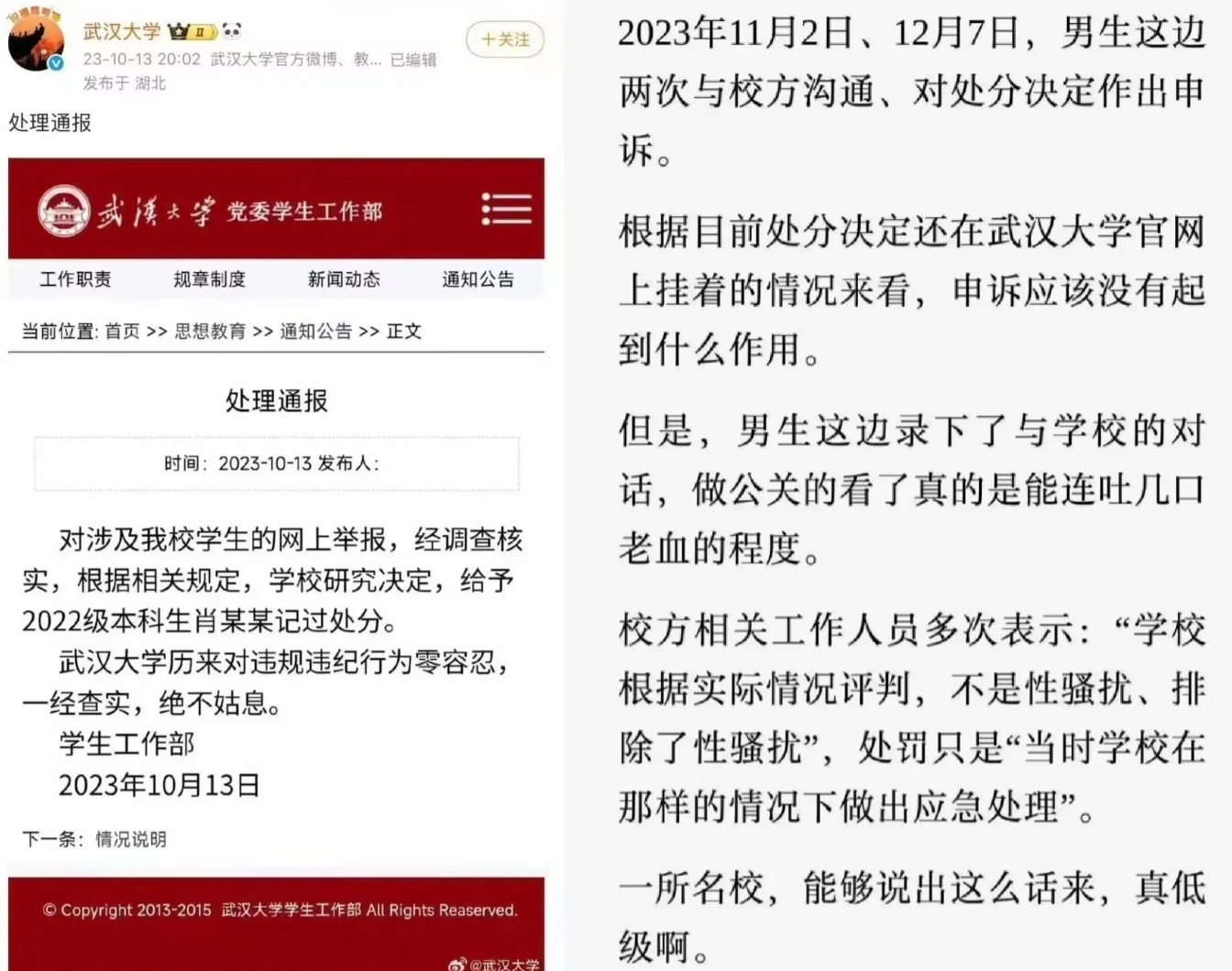 此外,武汉大学领导层,在没有证据论证的情况下,仅仅为了平息因为女生制造的舆论而牺牲肖同学,协同杨某某对肖同学展开精神迫害,包括但不仅限于协同杨某某逼迫肖同学认错、单方面强迫给肖同学加以记过处分等行为,以体现了极大的程序不正义。在法治社会与聚光灯下,如此无法无天的逍遥所为,激得天怒人怨也情有可原。