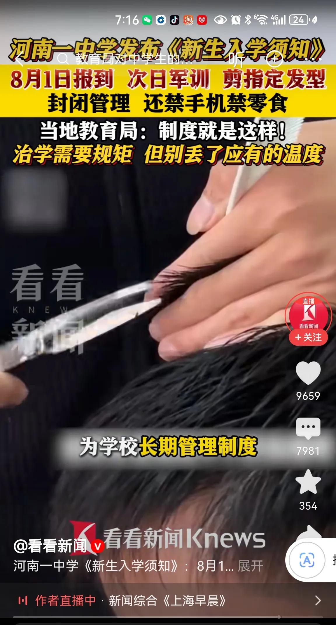 河南一中学要求学生8月1日报到,入学要求苛刻引热议 近日,河南一中学发布《新生入学通知》: 8月1日,新生报到; 次日军训; 剪指定头型:男生小平头或短发;女生留“前不过眉,后不过领”的短发; 封闭式管理; 严禁带手机、平板、零食进校园… 教育局回应:制度就是这样 网友评论各执一词: 有人支持,学校就应该这样管理,我儿子学校就是这样的规定! 有人反对,太苛刻了,连头型都要有要求 老教师认为: 其他都能接受。但是8月1日报到,次日军训。三伏天,持续高温,孩子们受得了吗? 希望学校校长老师,天天和孩子们顶着烈日站军姿! 我们的教育,只有苛刻的制度,没有以人为本的温度,就是对学生的一种戕害!