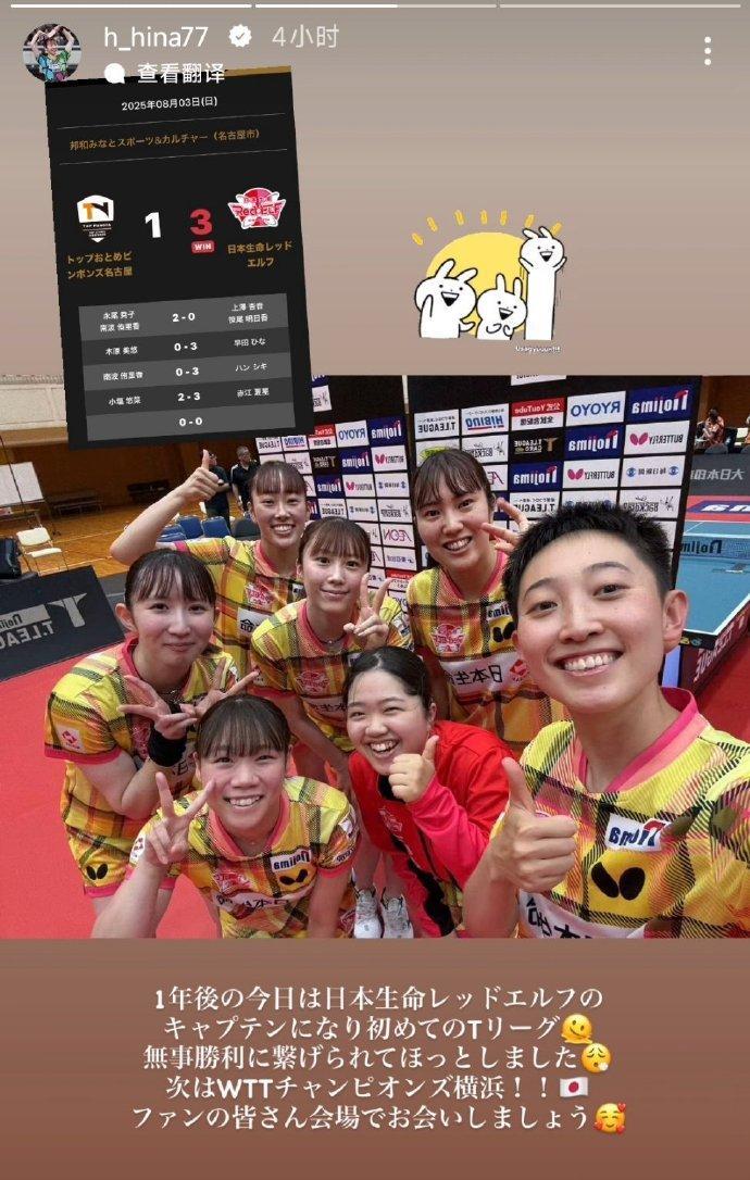 早田希娜也在日本打T联赛,没有参加球星挑战赛伊瓜苏的比赛。 早田希娜也更新了动态