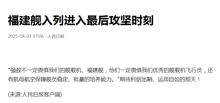 中国底牌再增一张,福建舰入列进入冲刺阶段! 8月3日,人民日报重磅发文透露,国产