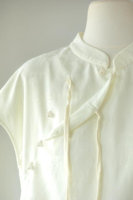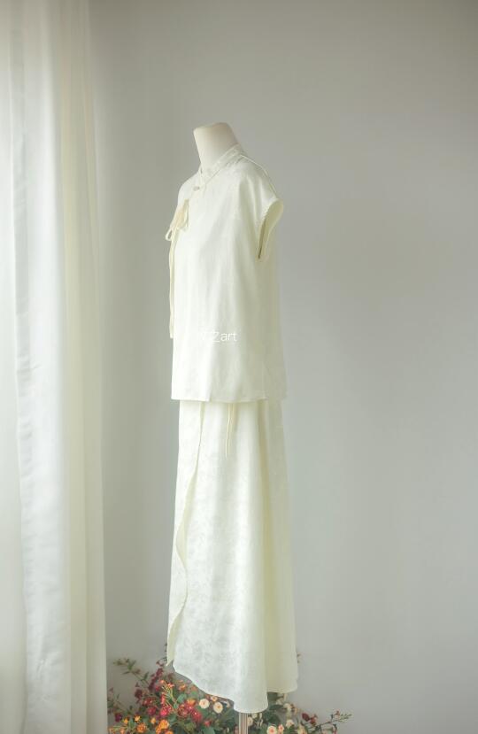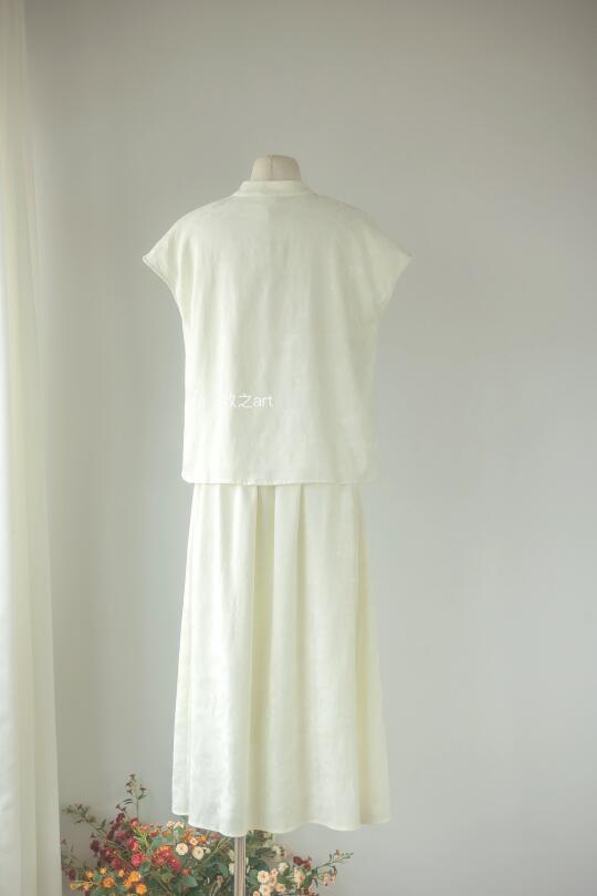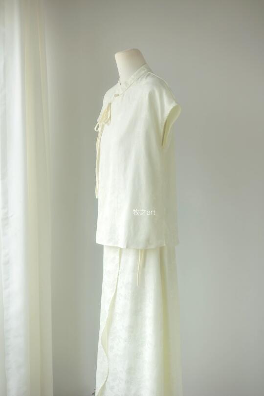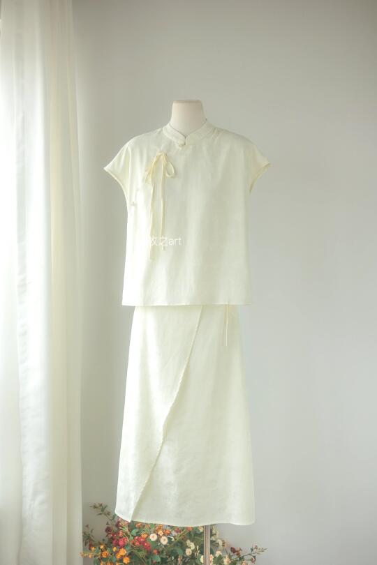 国风白色光套装 夏天适合简单清爽的美 不是生硬的本白色,偏柔和的颜色,不需要太多修饰 穿上就有种自然的高级感 缎面独特的气质,光泽感刚刚好,显得比较贵气 上衣是宽松的版型,不跳身材 半裙是常规A字版,前片多一片做装饰,不会走光 后面是弹力橡筋腰头,自然形成的褶皱遮肉显瘦 -
