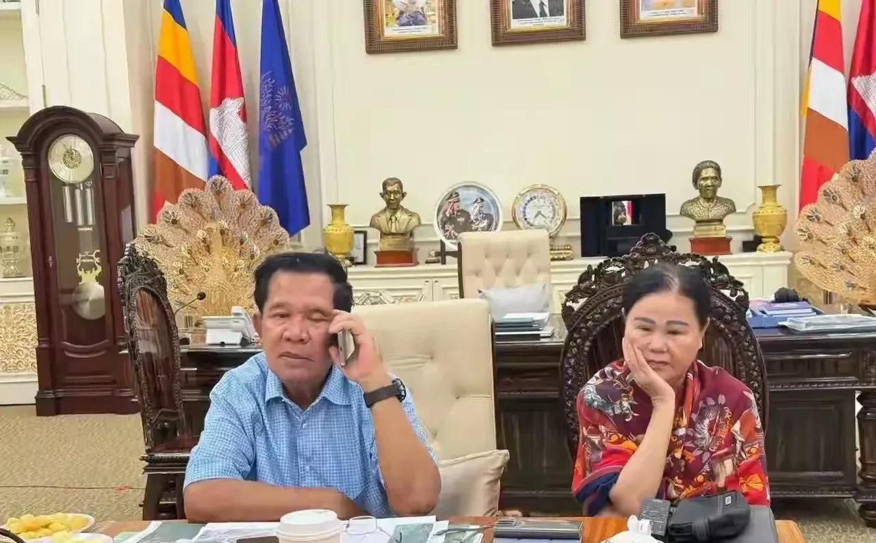 这幅图片显示了在柬埔寨洪森府邸已达到“家国一体两用”,背后有国王、前国王、太后三人画像及国旗,表明是处理国事的办公室;妻子陪伴左右,又说明是“老两口”的家室!