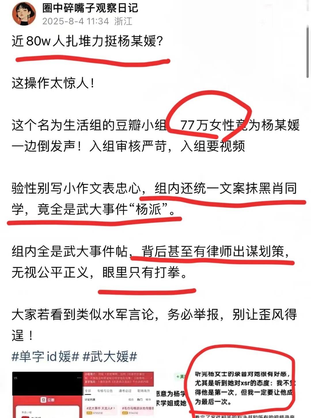 你敢信豆瓣上有个80余万人的生活组, 全都是支持杨景媛的, 更有甚者主动为杨景媛“辩护”, 这些“人”难道连法院判决都不服气? “武大事件杨派”、“律师出谋划策” “愿意帮助进行公益代理上诉”、 “我不认为他是第一次,但我一定要让他成为最后一次。” 看看这些言论,公然表明要为构陷者脱罪, 顾左右而言他,企图颠倒黑白,太可怕了。 这些“人”似乎有组织,有纪律,话术统一,攻击性极强。 武汉大学如果依旧选择沉默,那恐怕百年的声誉要悬了。 对此你怎么看?