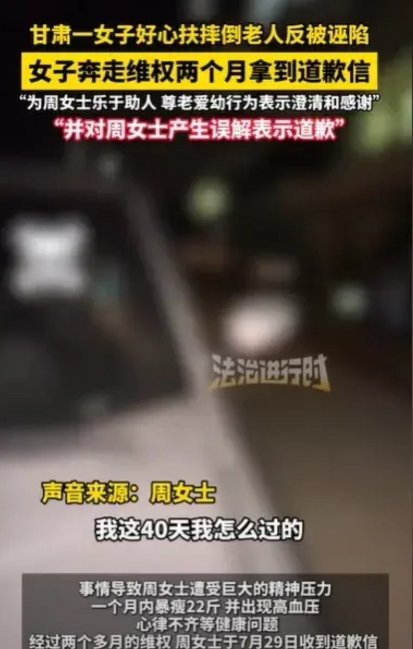 据法治进行时报道,7月29日,周女士从民警那里,得到了老人家属所写的道歉书,她哭了,两个月了,不知道自己是怎么过来的,现在终于得到一个说法了。