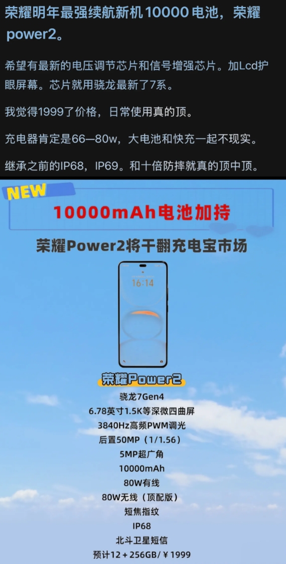 荣耀这操作真的是让人惊掉下巴!原本以为遥不可及的1万毫安大电池,就这么轻描淡写的要给荣耀Power2用上了? 买了荣耀Power的朋友怕是想拍断大腿,要是做个等等党,不仅有更强的性能,还有更大的电池可供选择,而且价格还诚意满满。