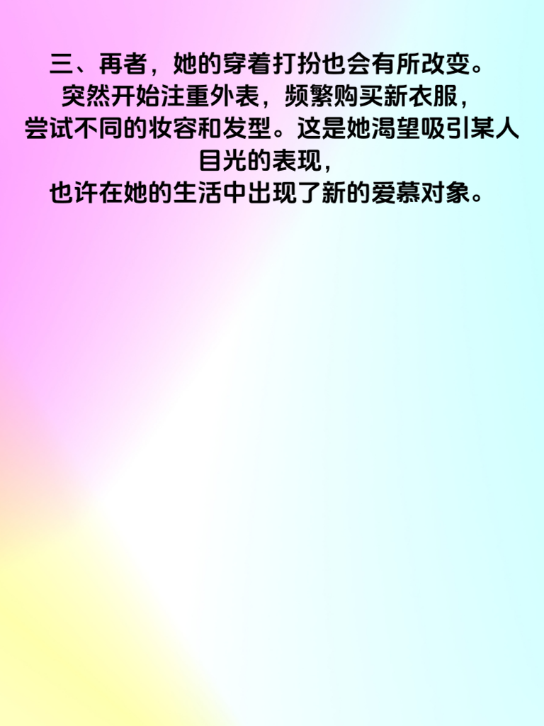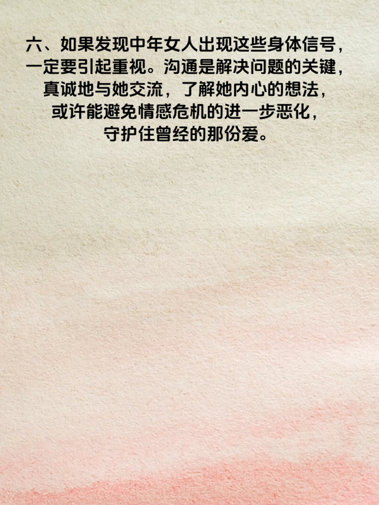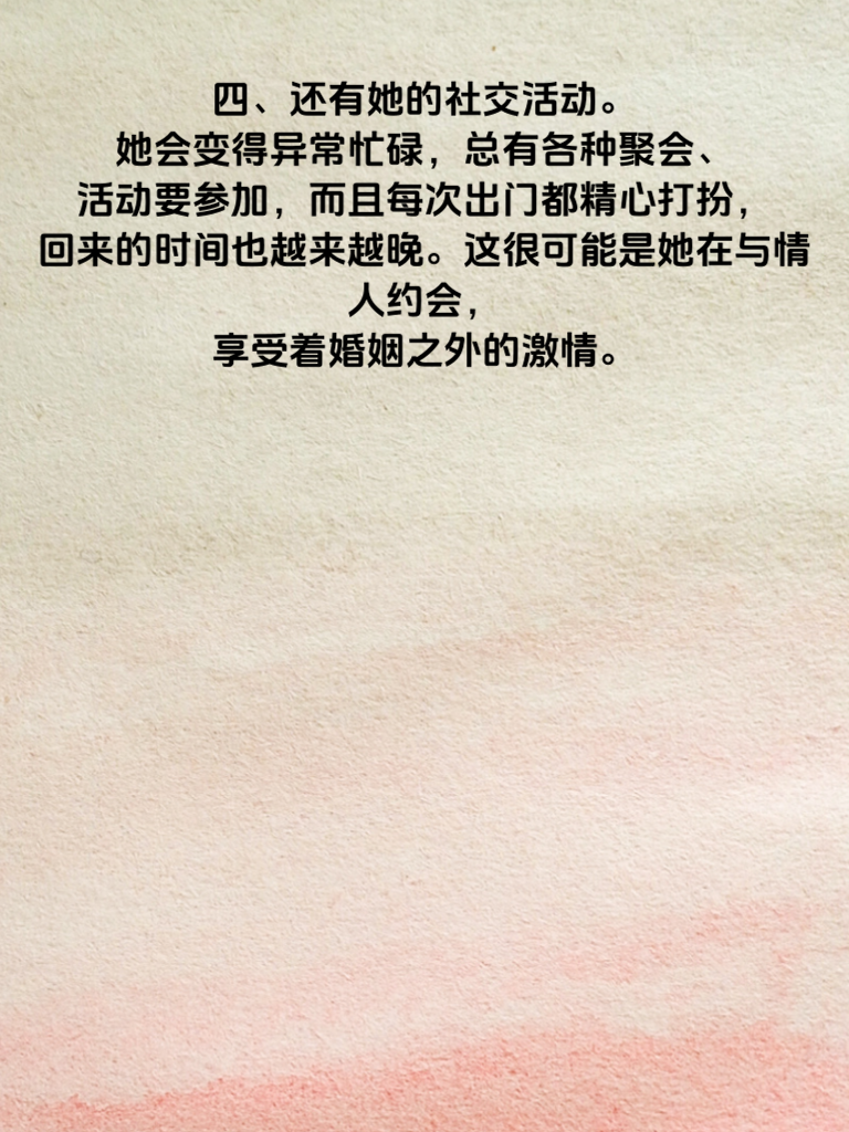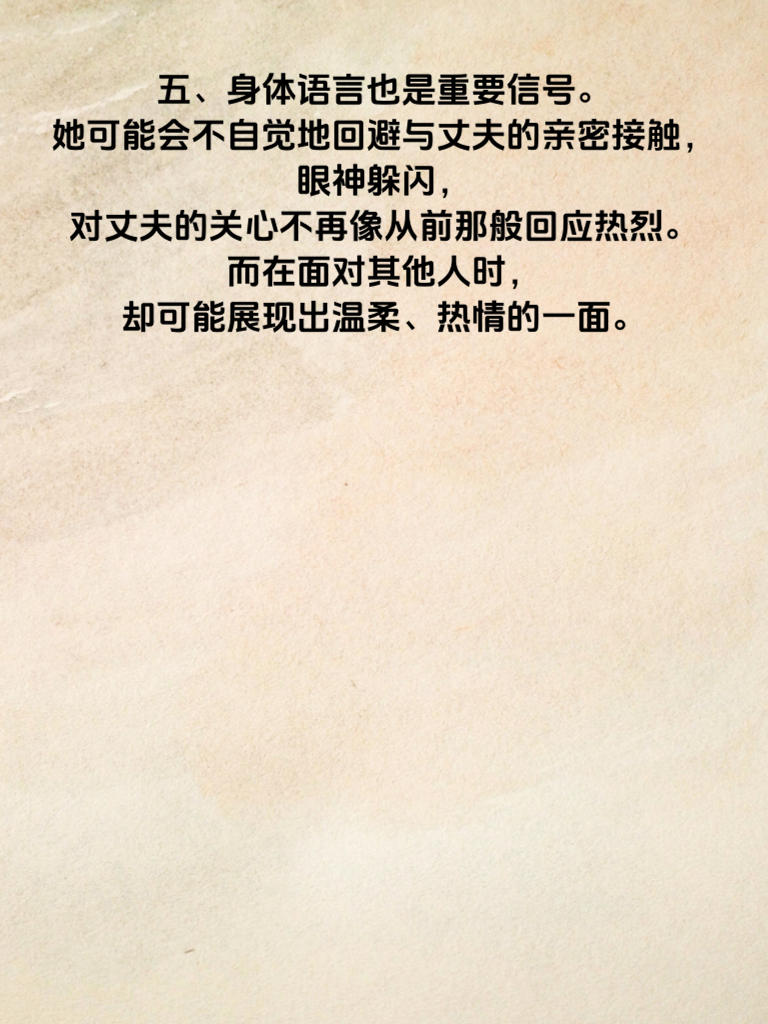 一、中年女人的情感世界往往比表面看起来更为复杂。当婚姻走过多年,一些细微的变化可能预示着潜在的危机,而出轨就是其中一种可能出现的状况。身体,常常会在情感变化时发出信号。 二、首先,她的作息可能会变得不规律。原本早睡早起的她,开始频繁熬夜,或是早上赖床不起。这可能是因为她的心思被其他事情占据,夜晚辗转难眠,或是在和情人的相处中打乱了正常的生物钟。 三、再者,她的穿着打扮也会有所改变。突然开始注重外表,频繁购买新衣服,尝试不同的妆容和发型。这是她渴望吸引某人目光的表现,也许在她的生活中出现了新的爱慕对象。 四、还有她的社交活动。她会变得异常忙碌,总有各种聚会、活动要参加,而且每次出门都精心打扮,回来的时间也越来越晚。这很可能是她在与情人约会,享受着婚姻之外的激情。 五、身体语言也是重要信号。她可能会不自觉地回避与丈夫的亲密接触,眼神躲闪,对丈夫的关心不再像从前那般回应热烈。而在面对其他人时,却可能展现出温柔、热情的一面。 六、如果发现中年女人出现这些身体信号,一定要引起重视。沟通是解决问题的关键,真诚地与她交流,了解她内心的想法,或许能避免情感危机的进一步恶化,守护住曾经的那份爱。