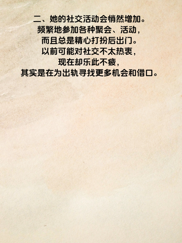 一、中年女性出轨前,往往会在情绪上出现明显波动。原本温和的她,可能会变得异常烦躁,对家人的琐事容易大发雷霆。这是因为她内心的情感天平开始倾斜,对现有生活产生了不满。 二、她的社交活动会悄然增加。频繁地参加各种聚会、活动,而且总是精心打扮后出门。以前可能对社交不太热衷,现在却乐此不疲,其实是在为出轨寻找更多机会和借口。 三、在与伴侣的相处中,会出现明显的变化。不再像以前那样亲密无间,开始刻意保持距离,甚至对伴侣的关心和询问表现出不耐烦。这是她内心有了新的情感寄托,想要摆脱现有关系的一种表现。 四、对自己的外表和形象更加在意。花费更多时间和金钱在穿着打扮上,购买新的化妆品和衣服。这不仅是为了吸引新的对象,也是对自己即将开启新感情的一种期待。中年女性出轨前的这些征兆,值得我们警惕和关注。