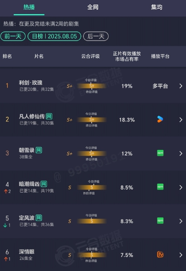 很显然,优酷已经把宣传的重点放在这部剧上了,这两天《凡人修仙传》的营销明显减少了,云合播放量已经连续两天被《利剑玫瑰》超越了,播的确实不太好,就看后面正午阳光那部《雨霖铃》能否让他回血了。