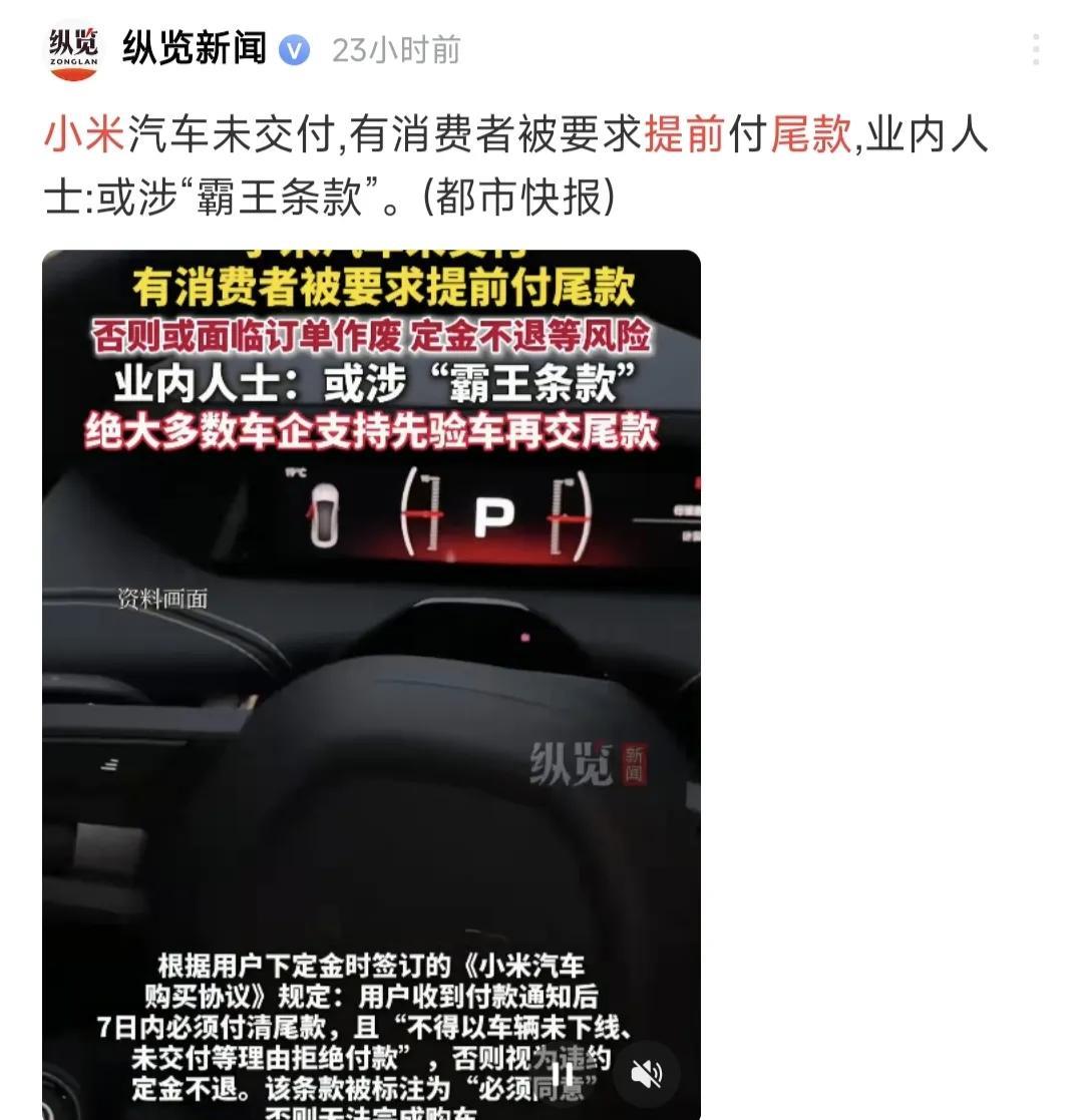 交定金->选车->造车->验车->交尾款->收车。这是一条健康的资金链路,这种情况下车企不造车就拿不到尾款。如果改变这个链条变成 交定金->选车->交尾款->造车->验车->收车,这时最大的问题就是即使车企不造车,也能收到全款。既然能收到全款为何还要造车?所以这种车企最大的可能就是面临资金链断裂,即将暴雷,无法支付供应商费用,面临供应商断供,无法继续维持下去的情况。#小米汽车# #华为,三星,小米怎么选# #小米汽车犹豫期#
